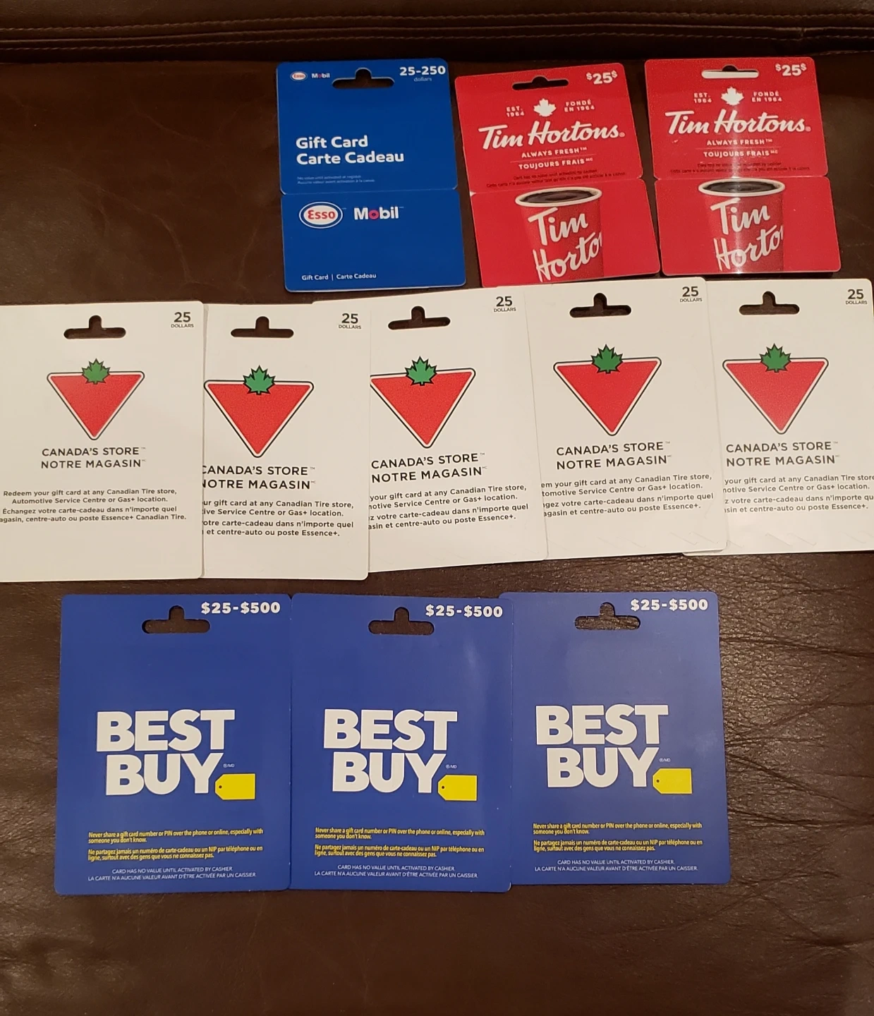 5I have 1 Esso, 2 Tim Hortons, 3 Best Buy, and 5 Canadian Tire Gift cards available at 20% discount. Each card is $25, so selling for $20 each. Buy the whole lot or whichever you are interested in.