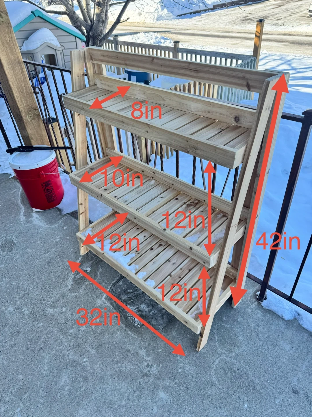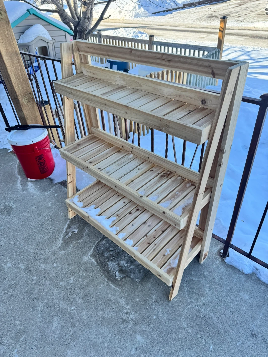 Three-tiered wooden plant stand. It's made of wood with a natural finish. The overall height is 42 inches. The base measures 32 inches wide. Delivery available with extra cost