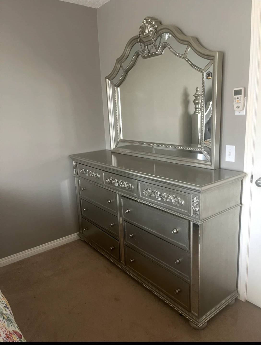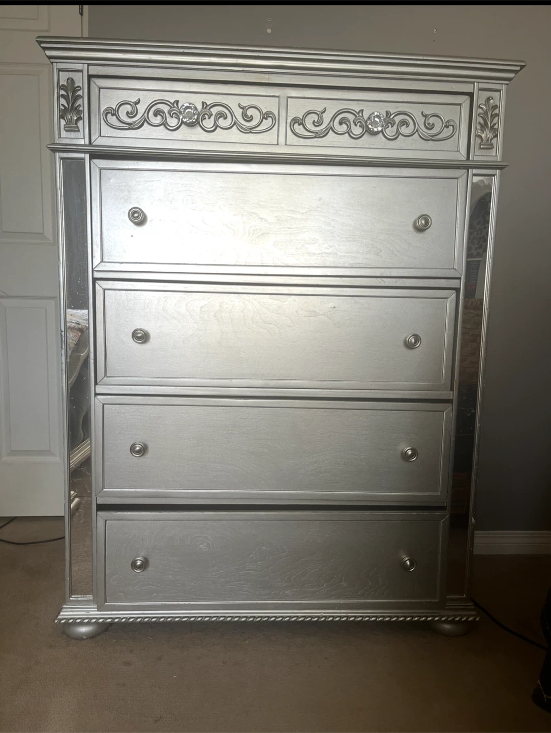 A stylish silver bedroom set with mirrored accents , includes 2 night stands, dresser with mirror, talk dresser , king bed frame . Does not include mattress