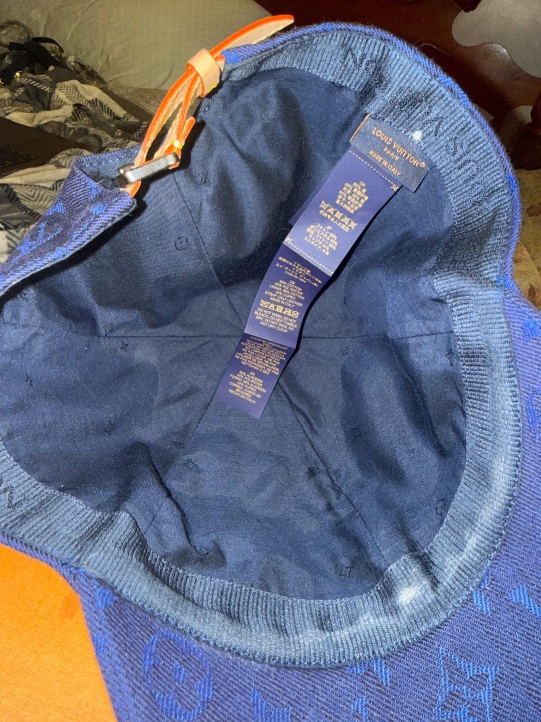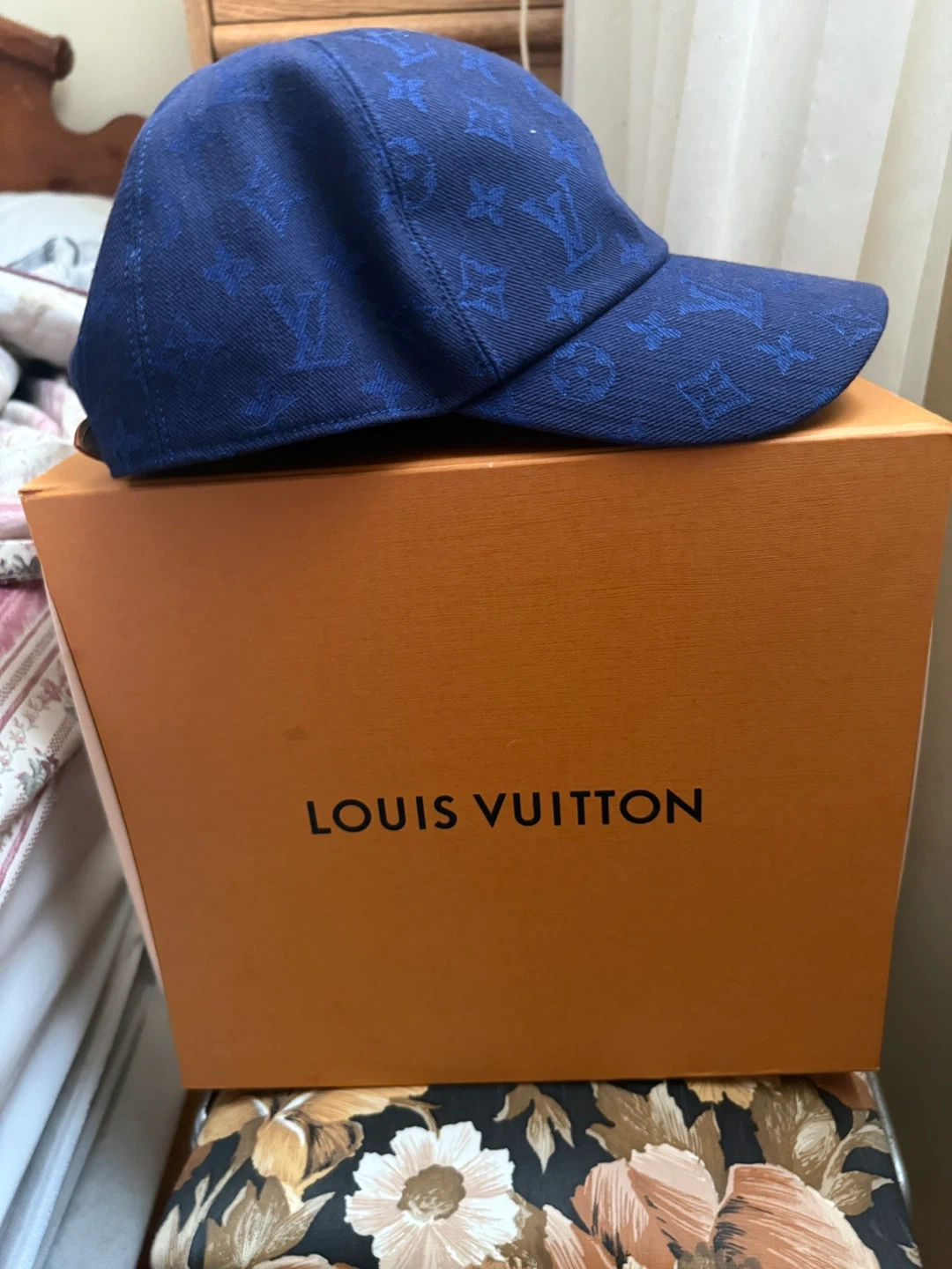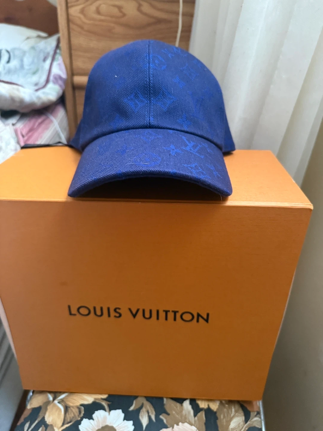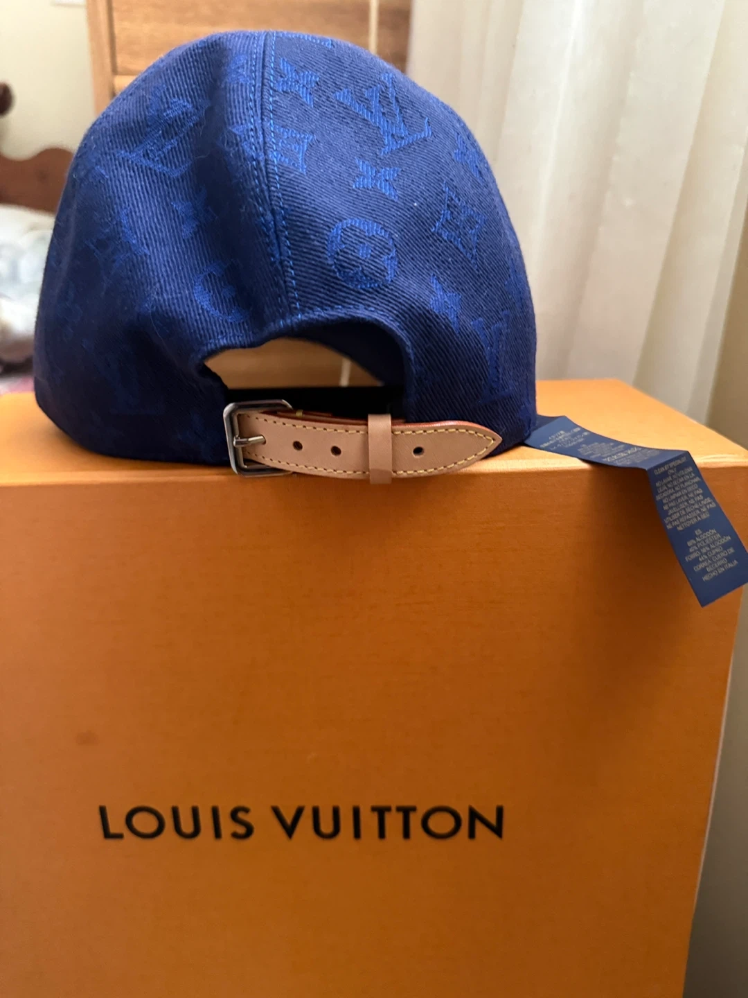 This is a blue Louis Vuitton baseball cap with the signature monogram pattern. It's made in Italy and features an adjustable leather strap. Includes original Louis Vuitton box. This cap is a stylish accessory for everyday wear.
