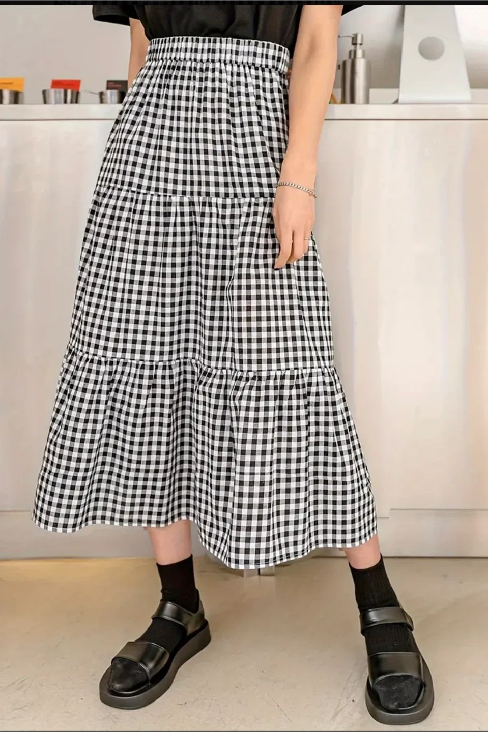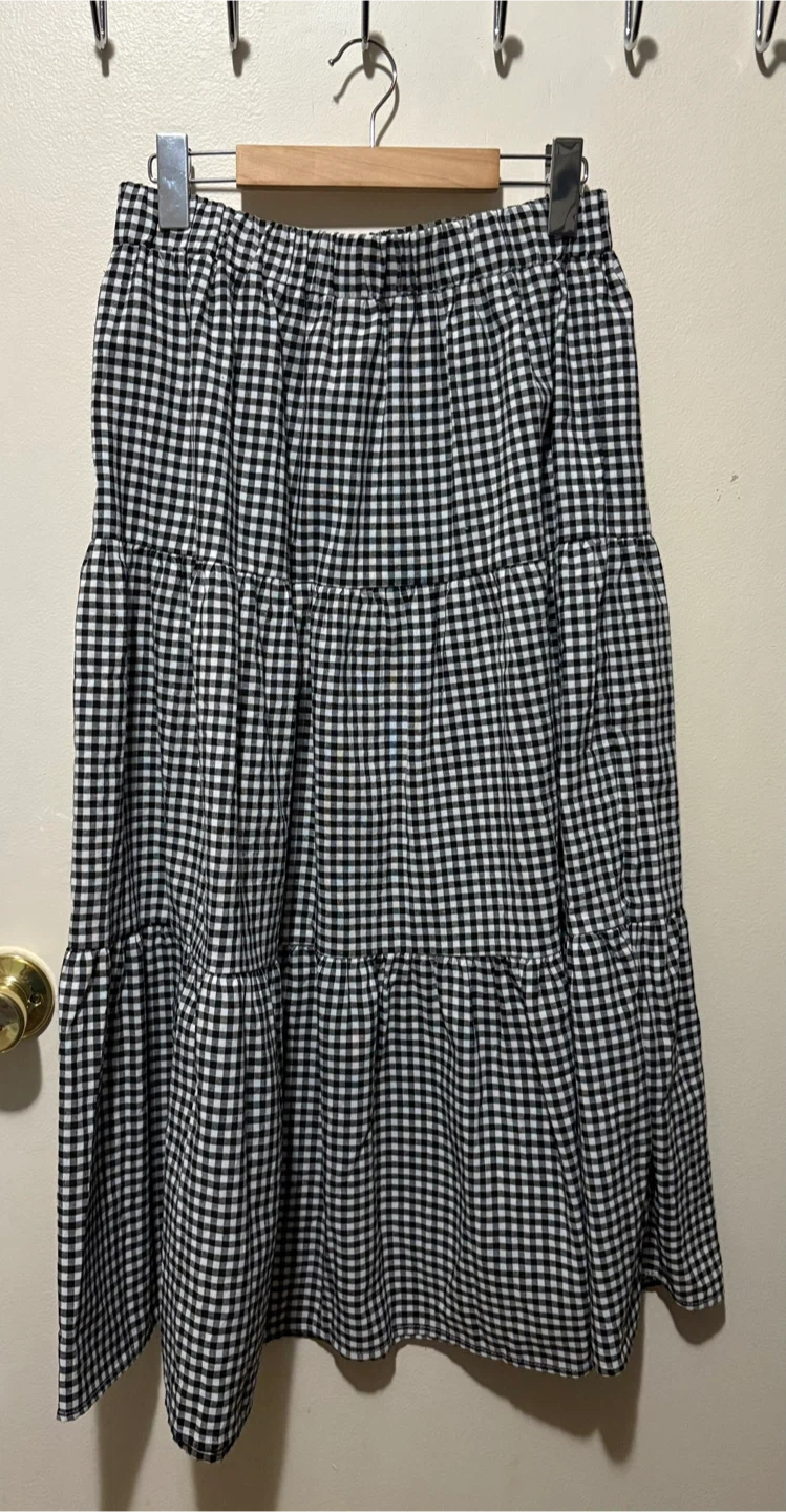 Selling a cute tiered midi skirt in a classic black and white gingham pattern. It's in excellent condition and perfect for spring or summer! New without Tag.