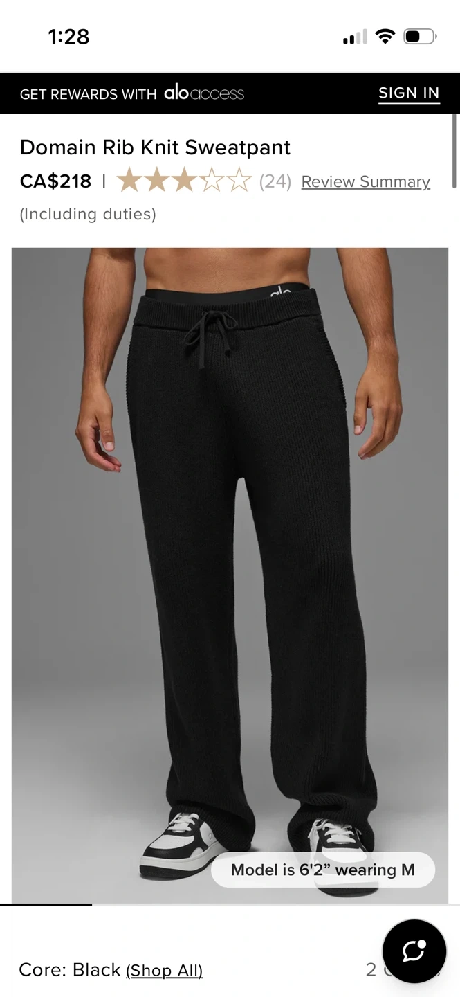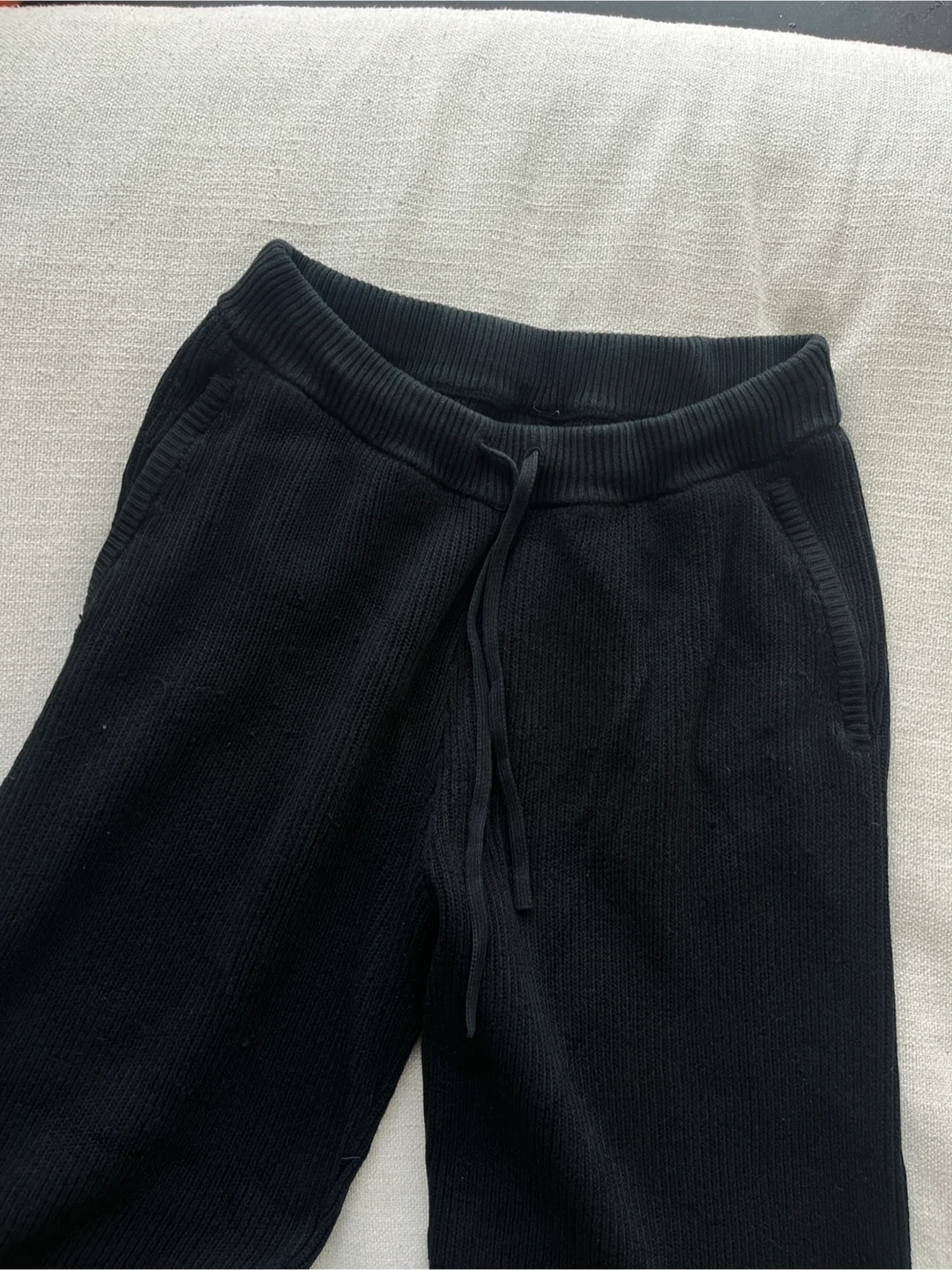 Alo Black Domain Rib Knit Sweatpants. They're made with a comfortable ribbed knit fabric. These pants feature a drawstring waist and zippered pockets. Bought from Alo at Eaton Centre and the condition is fairly good. Size was tagged M but can fit anyone up to a large. I’m small and worn these tighter with the drawstrings.