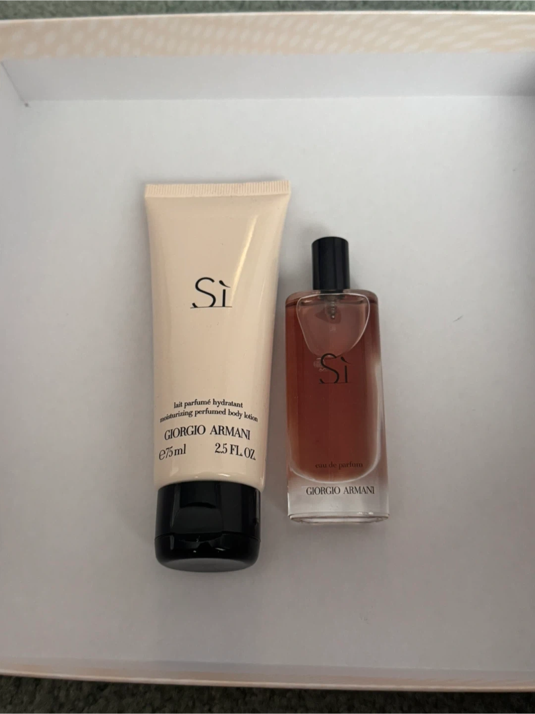 Selling a Giorgio Armani Si perfume and body lotion set. The body lotion is a moisturizing perfumed body lotion, and the perfume is an eau de parfum. The body lotion is 75ml / 2.5 FL OZ. Perfume is 15ml / 0.5 FL OZ.