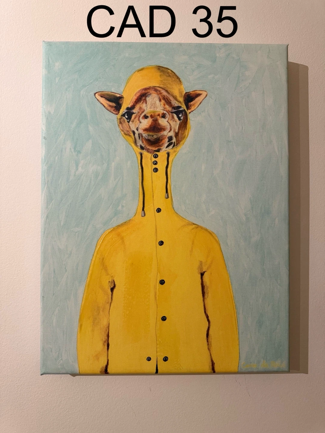 10Cute painting of a giraffe wearing a yellow raincoat! Would look great in a kid's room or anywhere you need a bit of whimsy