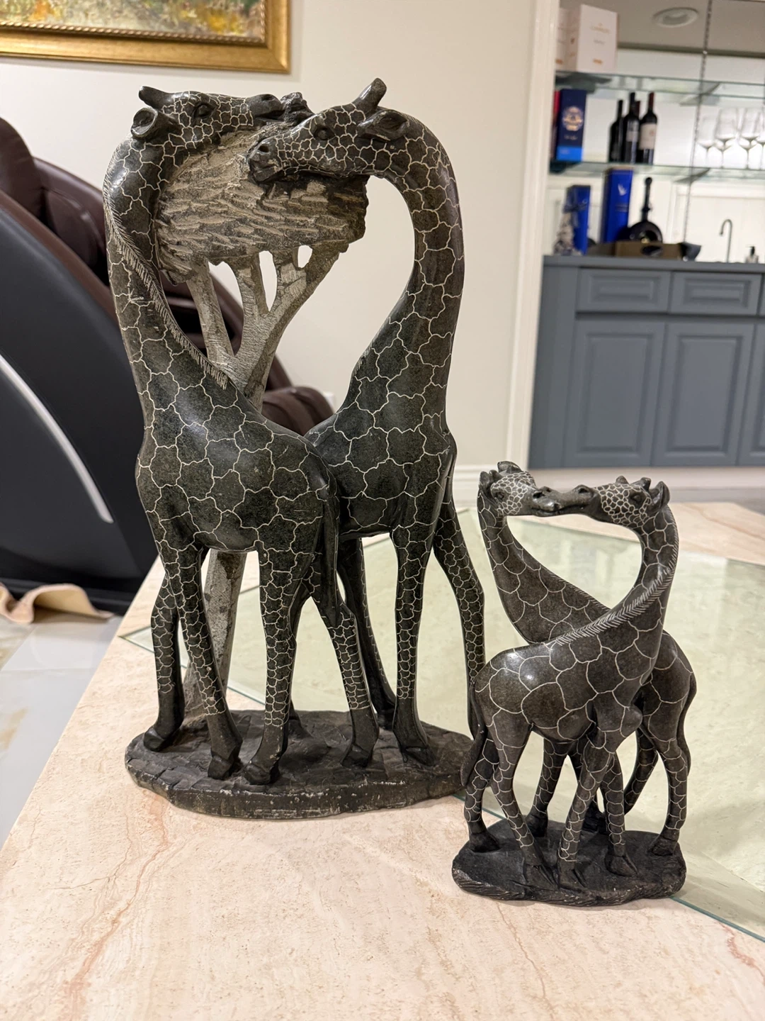 A pair of beautiful giraffe sculpture, perfect for adding a touch of wildlife charm to your home decor. The sculpture features detailed patterns and a unique design, making it a lovely decorative piece for any room
