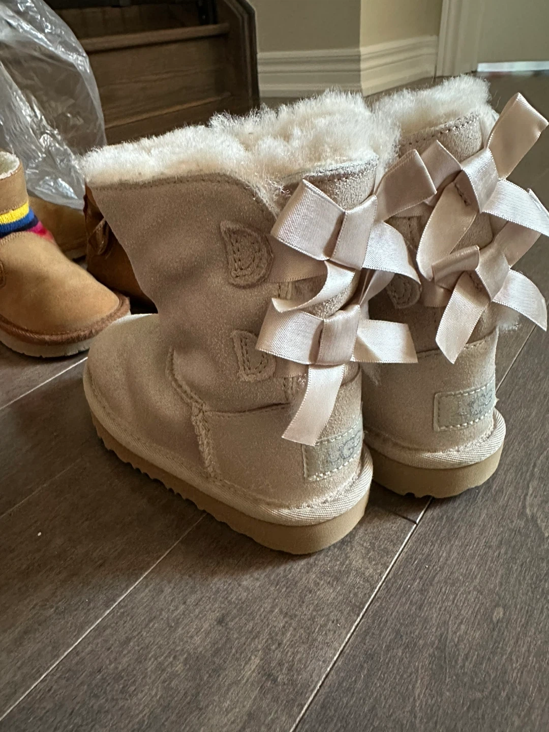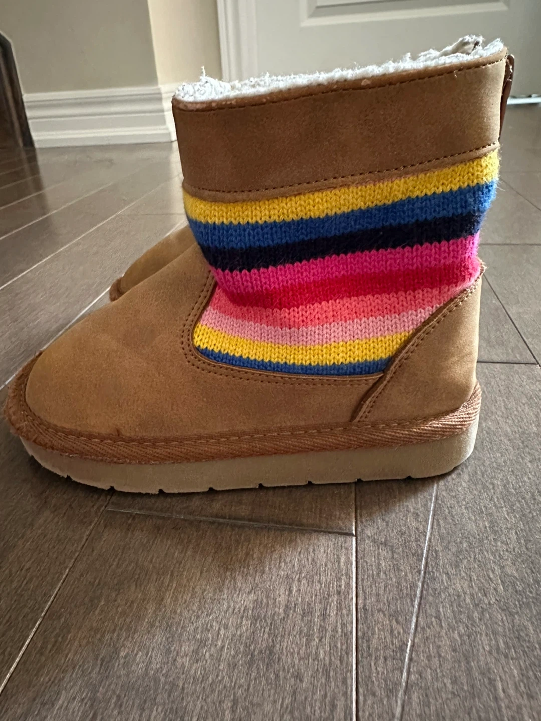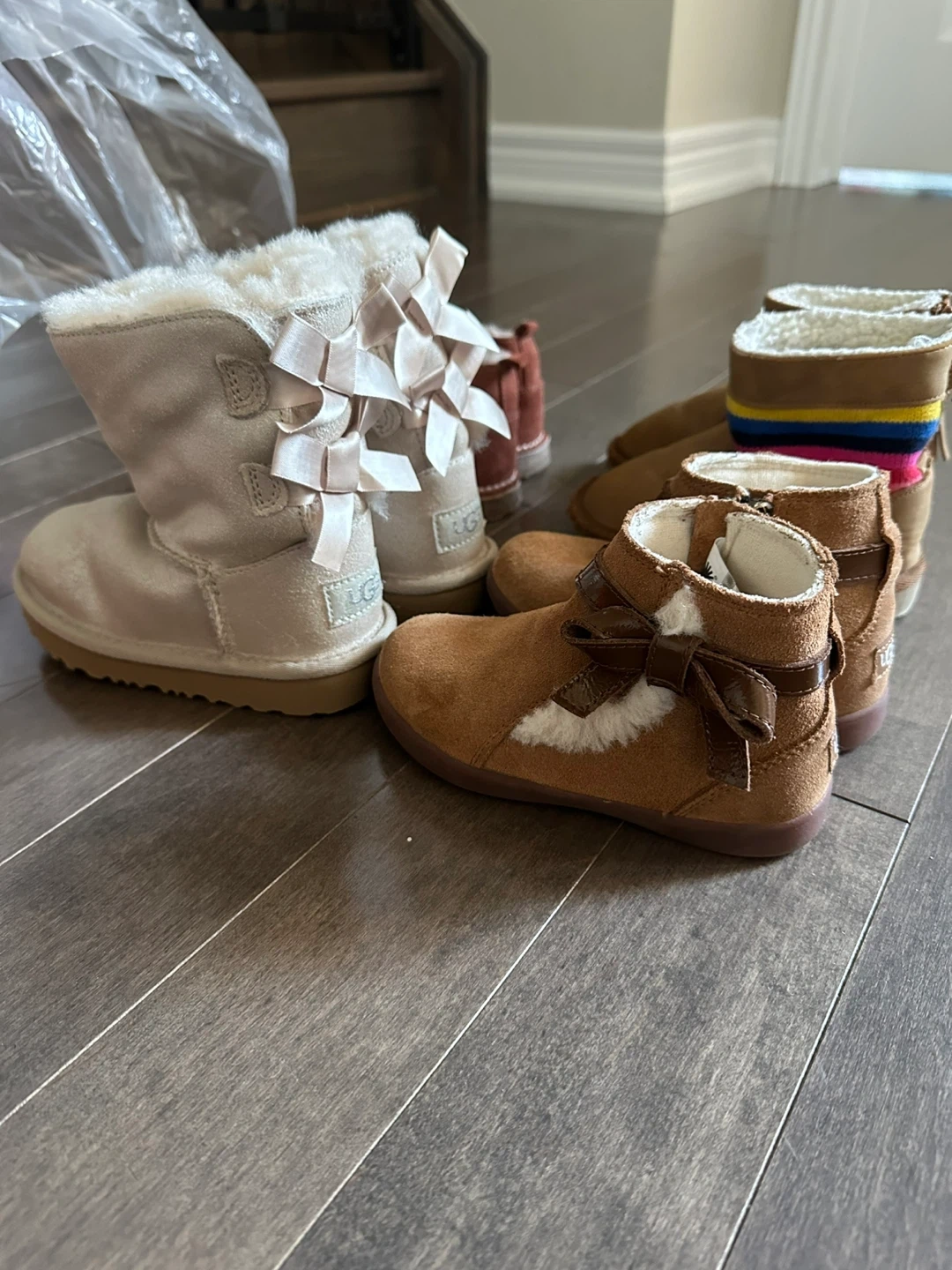 70Adorable UGG boots for kids. Soft and cozy with charming bow accents. Perfect for little feet. Pink ones are Zara, and multicolour is from gap, all size 9