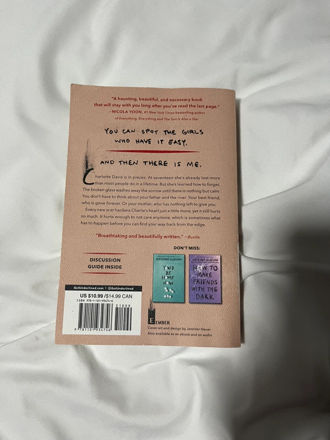 10Selling a copy of "Girl in Pieces" by Kathleen Glasgow! It's a novel that's a #1 New York Times Bestseller. The back cover has some great quotes about the book, calling it "haunting, beautiful, and necessary". Originally priced at $14.99 CAN
