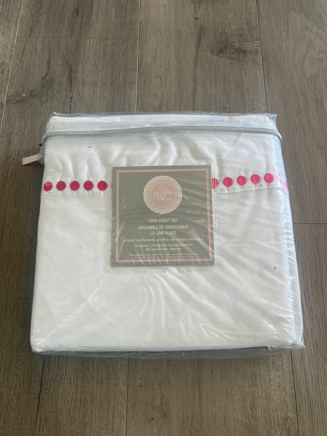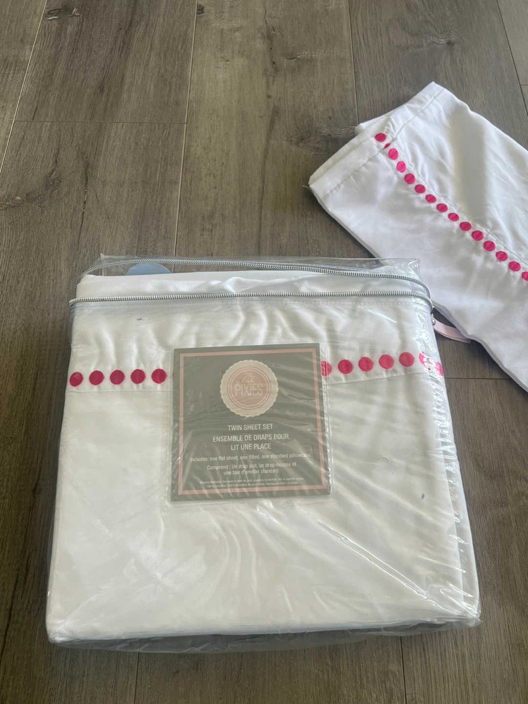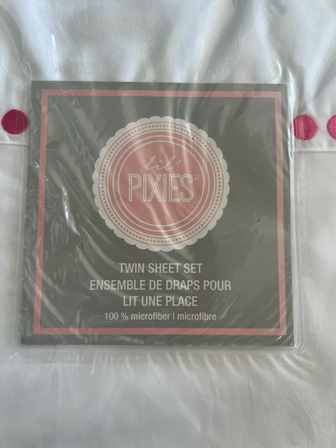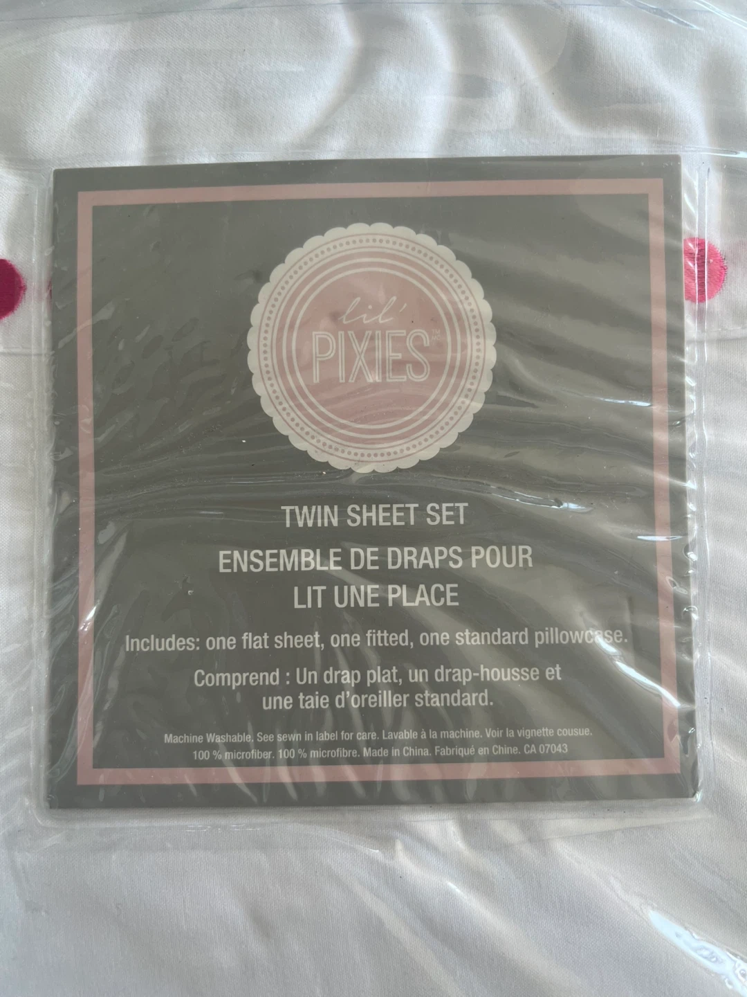 I have a brand new Lil Pixies twin sheet set for sale! It includes one flat sheet and one standard pillowcase. No fluted sheet! The set is made of 100% microfiber and is machine washable. Still in its original packaging, we only used the fitted sheet and it’s NOT included!