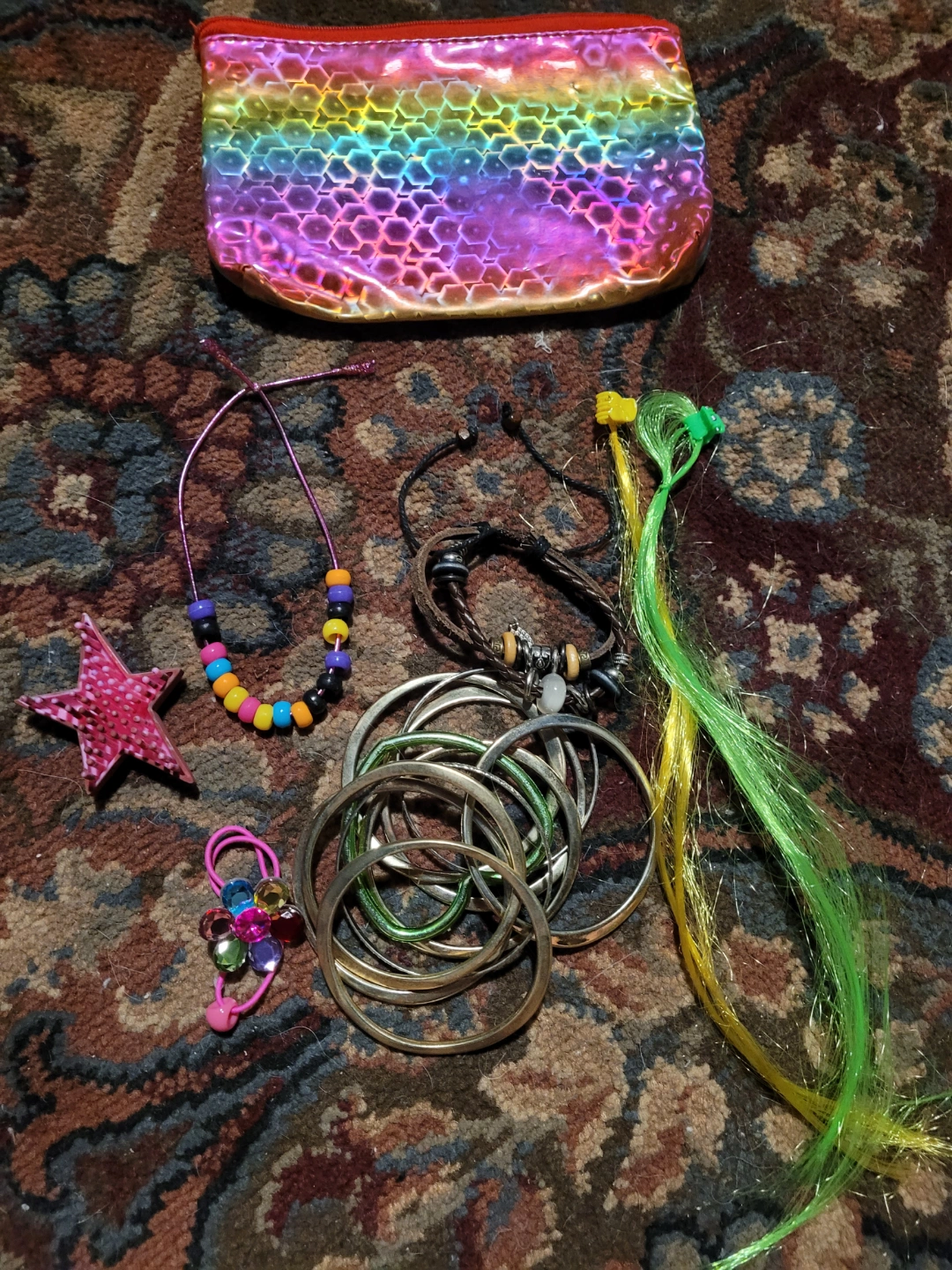 Large bundle of girls' accessories. Includes three Claire's link charms, a rainbow cosmetic bag, beaded necklace, bracelets, hair clips, hair extensions, four headbands (one Lululemon), and a small collection of miscellaneous items. Perfect for a young girl or for crafting. #freecycle pick up ONLY in Westwood