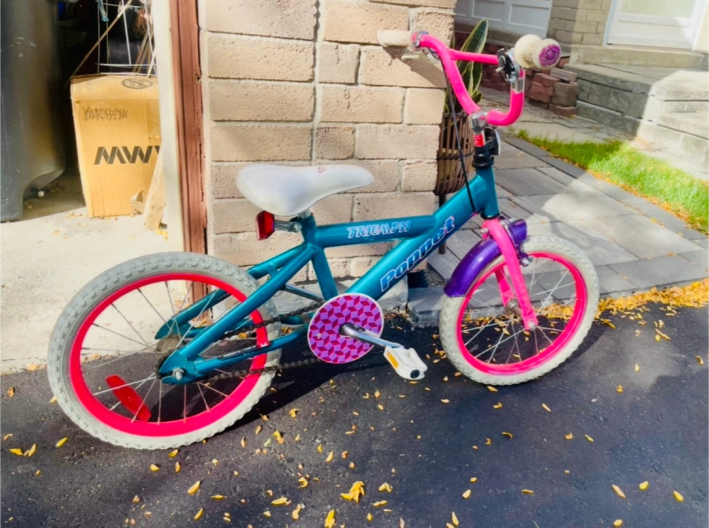 59Selling a girls bike in teal and pink! It's a cute bike that's ready for a new home. It has a white seat and purple mudguard. Perfect for a young rider! 16”
