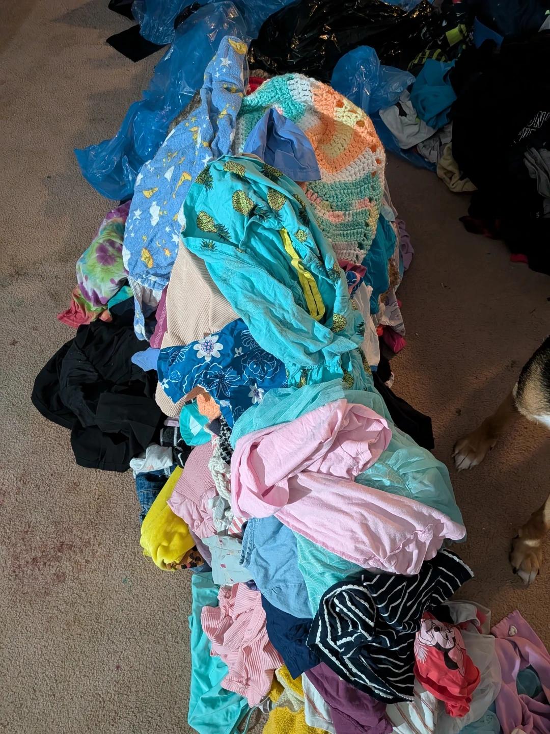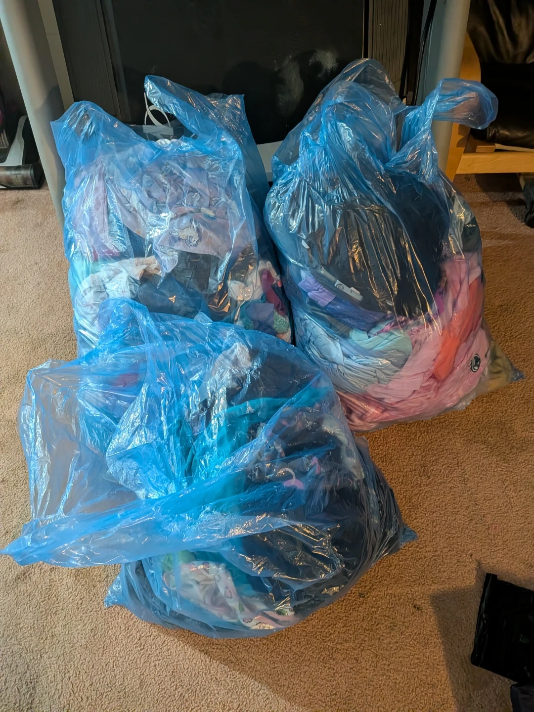 105I have 3 bags filled with girls' clothing for children sizes 4 and 3, which includes shirts, pants, and several dresses.
