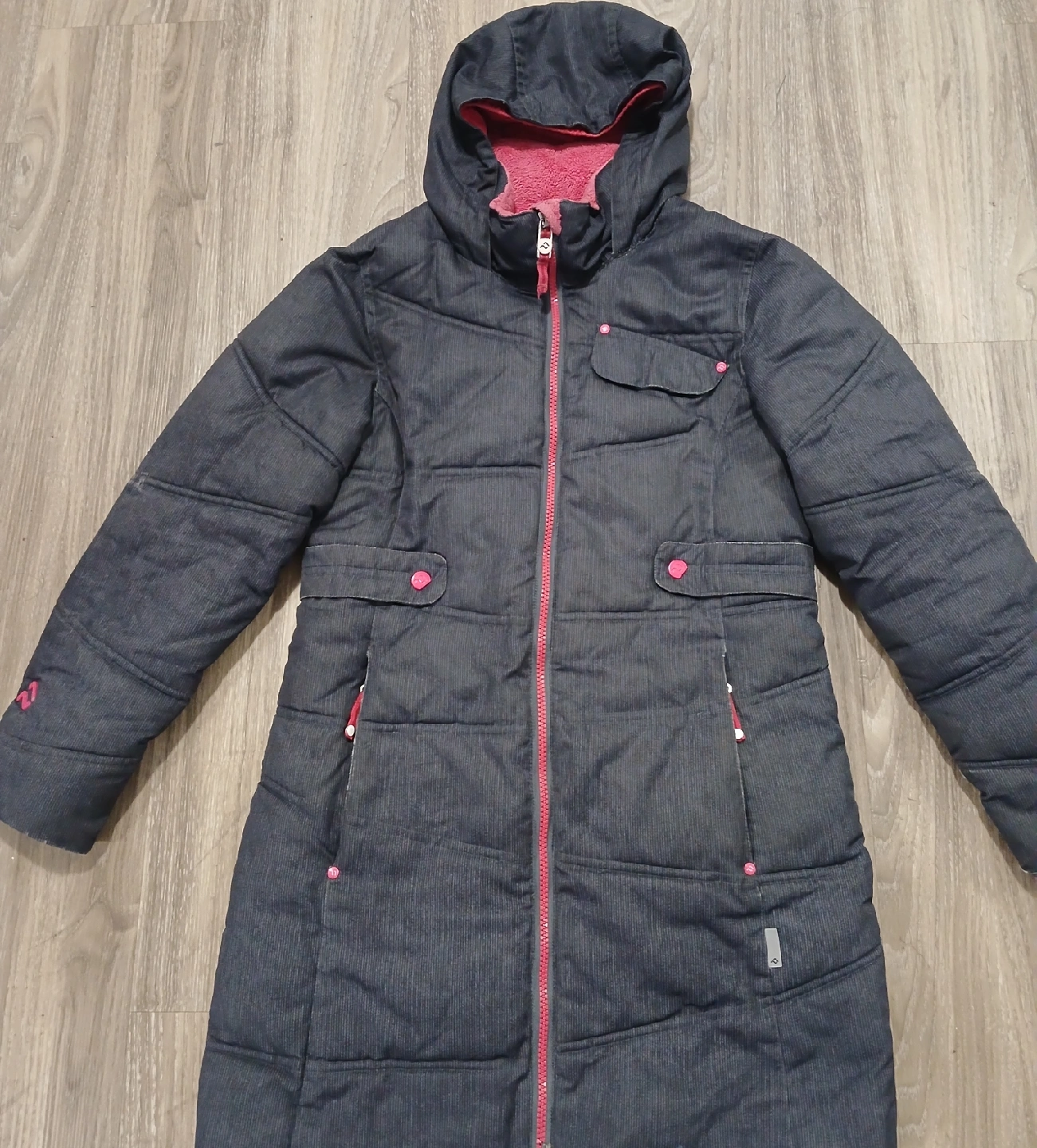 18Here's a cute girls' puffer coat with a denim look! It's a stylish and warm choice for those cooler days. The coat features a cozy hood and a bright pink zipper, adding a pop of colour!