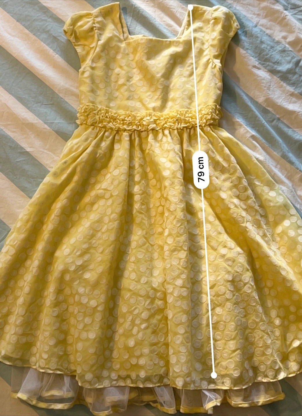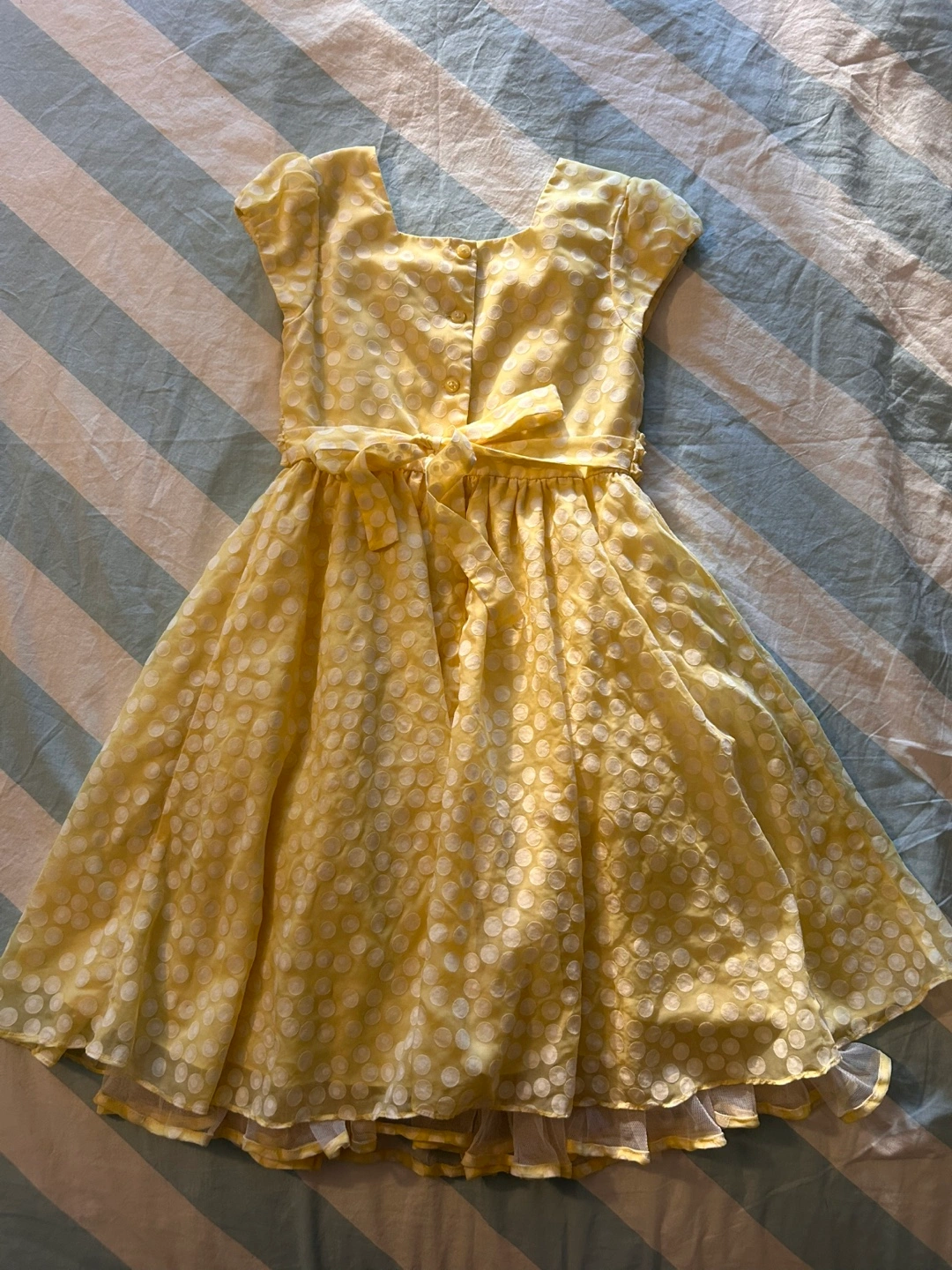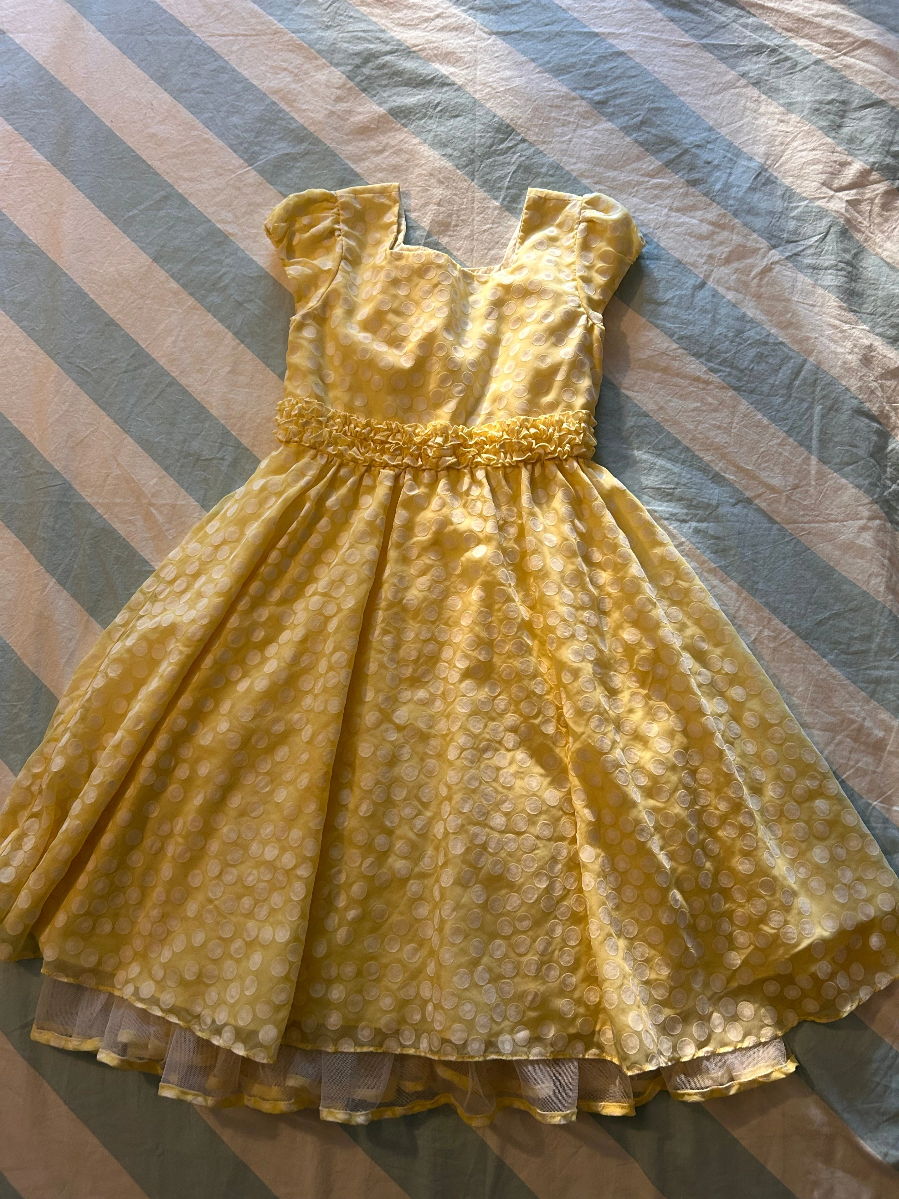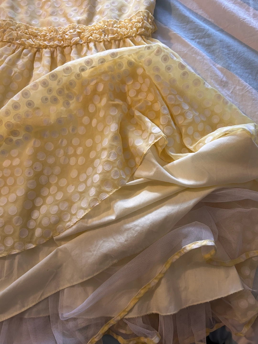 Girls' Dress Jona Michelle Yellow Polka Dot Skirt: Full, layered skirt with a sheer polka dot overlay and tulle/netting underneath for added volume. Closure: Button closure down the back. - CASH ONLY - SMOKE FREE HOME First come, first served