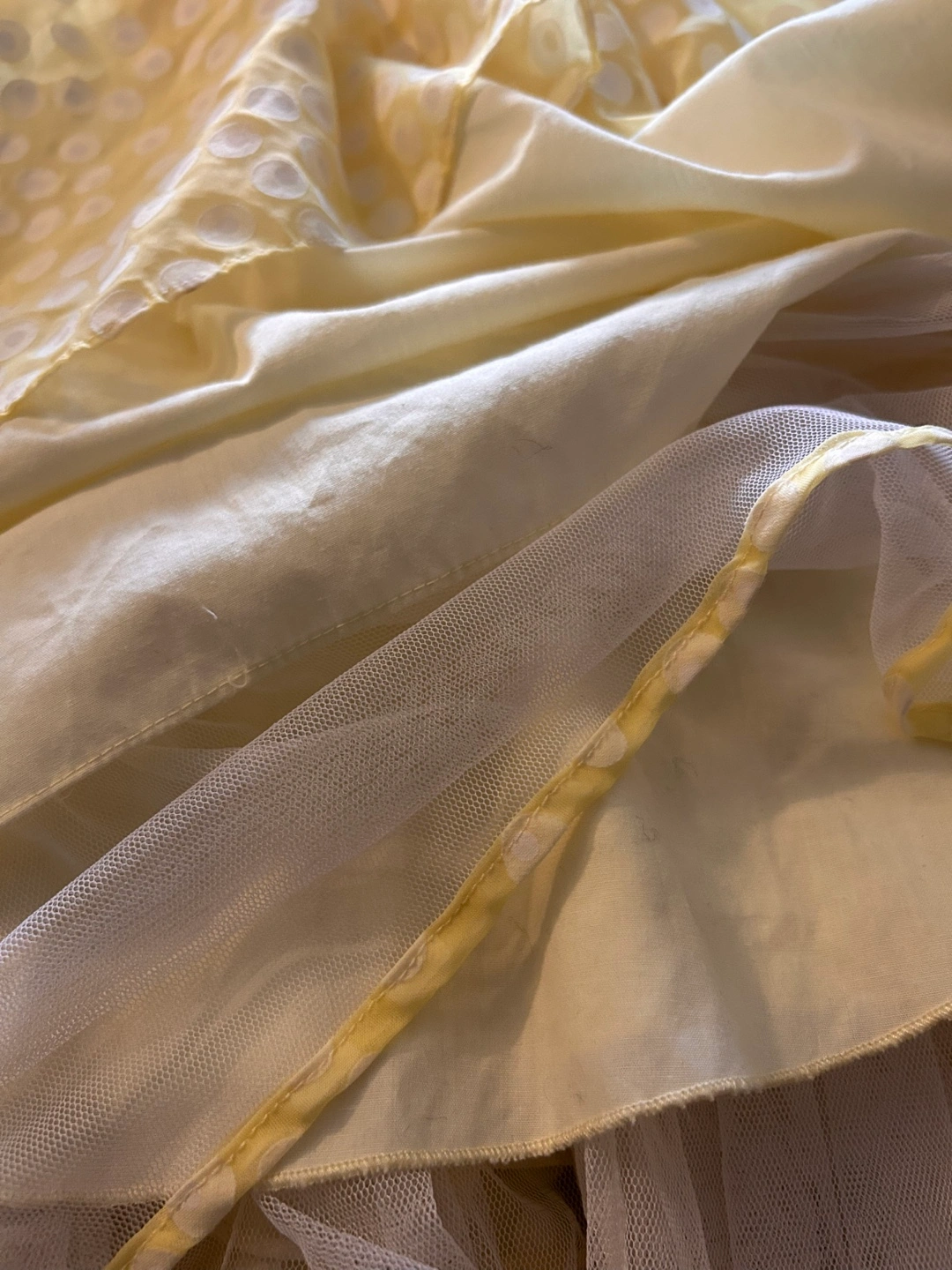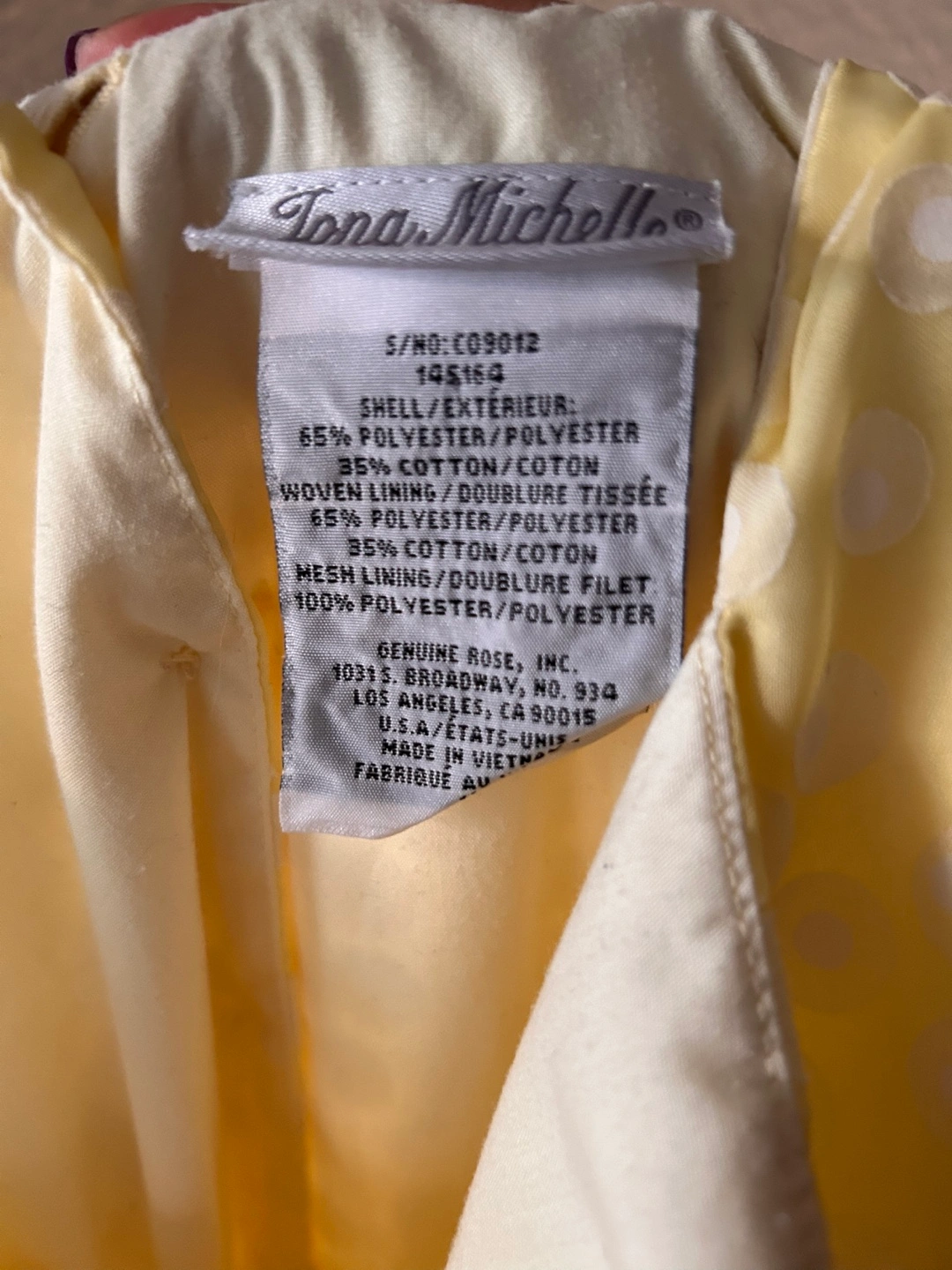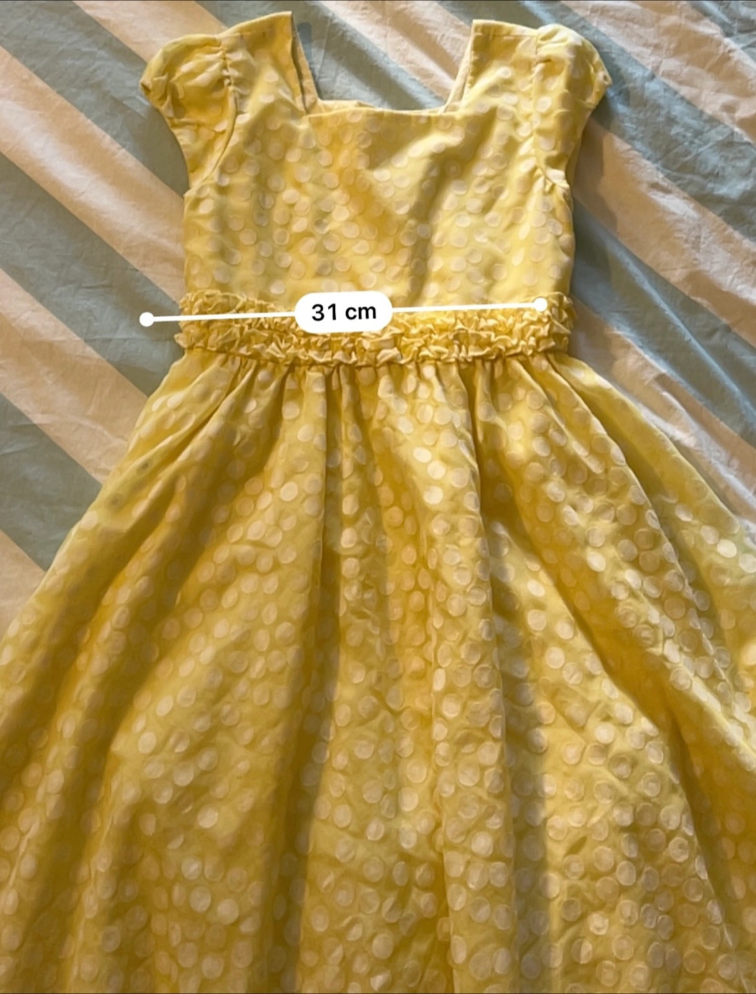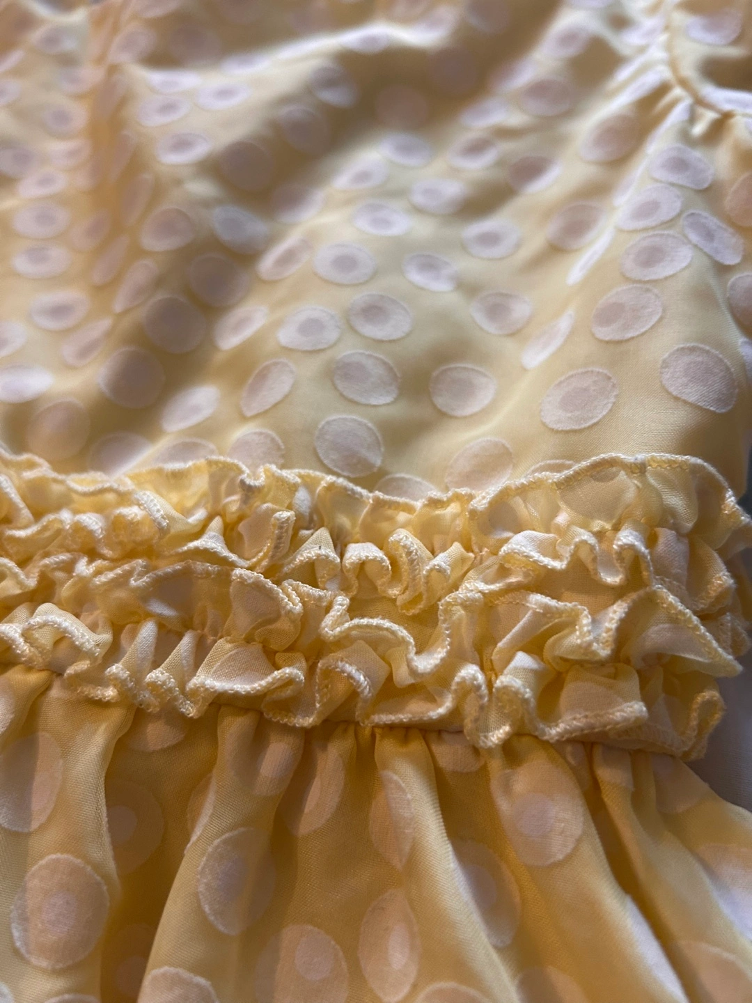 Girls' Dress Jona Michelle Yellow Polka Dot Skirt: Full, layered skirt with a sheer polka dot overlay and tulle/netting underneath for added volume. Closure: Button closure down the back. - CASH ONLY - SMOKE FREE HOME First come, first served