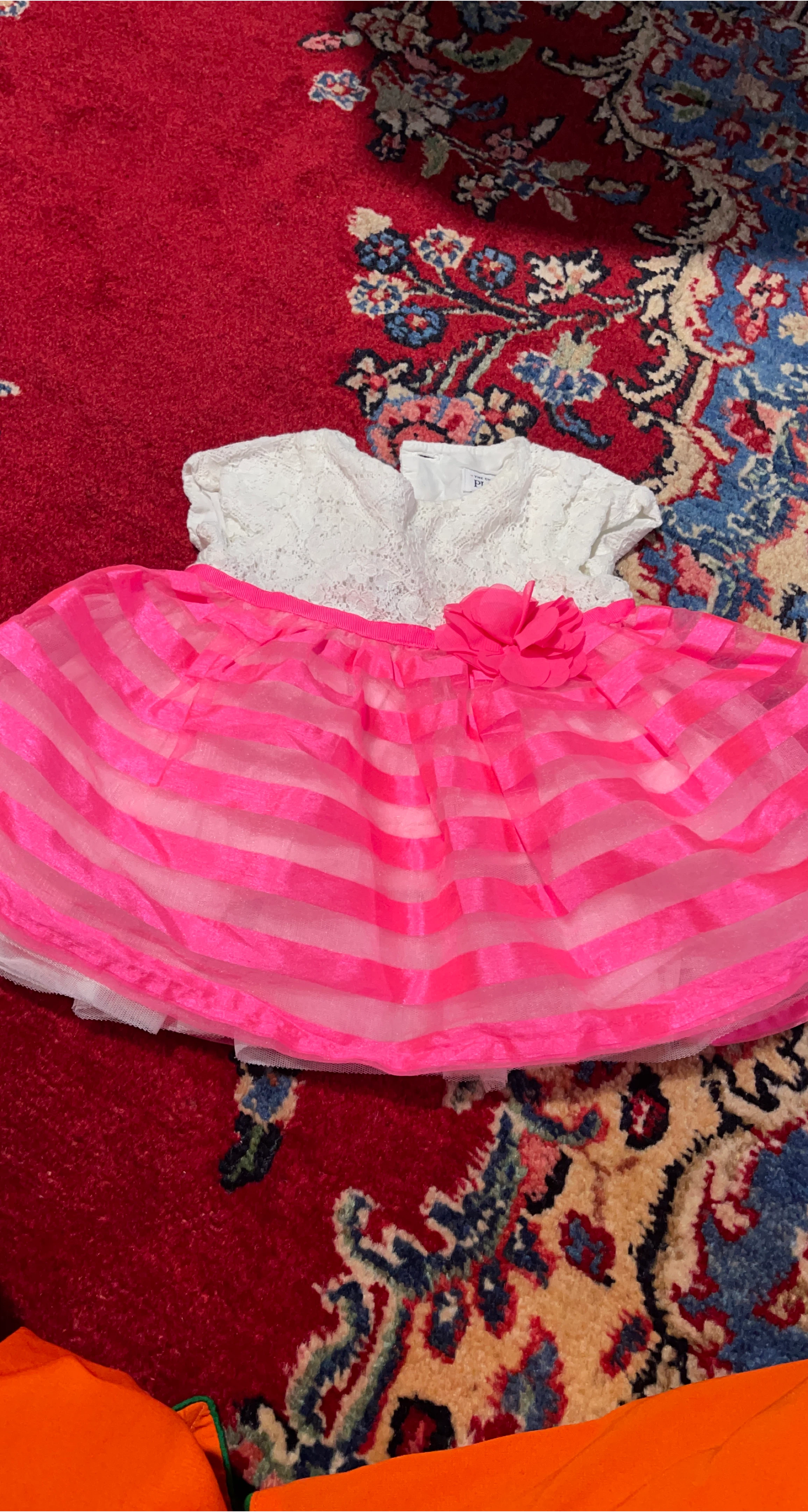 60A cute dress for a little girl! It features a white lace top and a vibrant pink striped skirt with a flower detail. Perfect for parties or special occasions 6-9 months