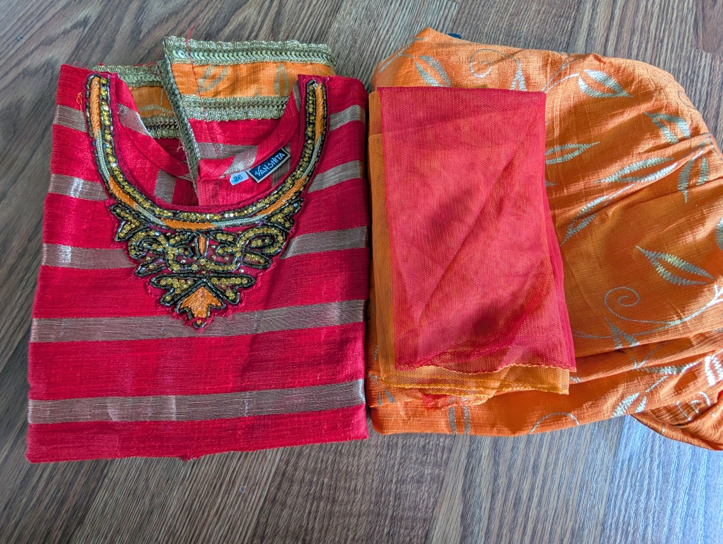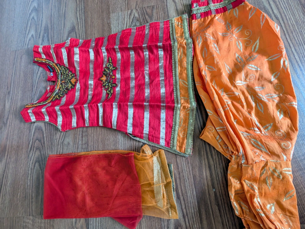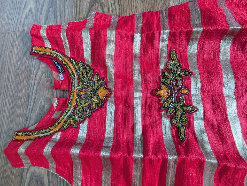 This is a beautiful Vanshita kids Indian outfit. It features a red and gold striped top with intricate beaded detailing around the neckline. The set includes orange pants with a gold leaf pattern and matching orange and red scarves. It's perfect for a special occasion or cultural celebration!