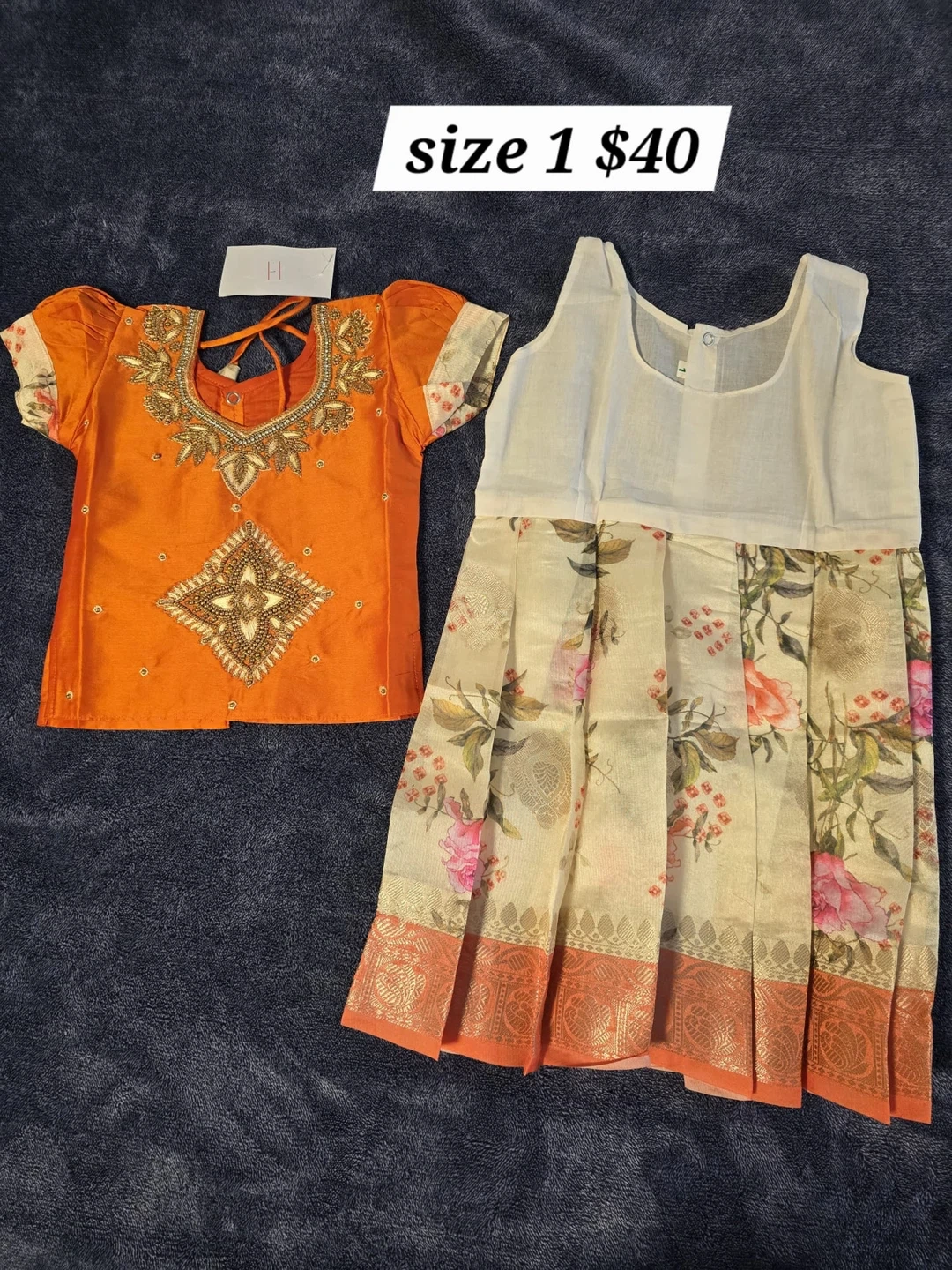 Selling a cute traditional Indian outfit for a little girl! It's a size 1 and includes both the top and bottom. The top is a vibrant orange, and the bottom has a lovely floral pattern. Perfect for a special occasion!