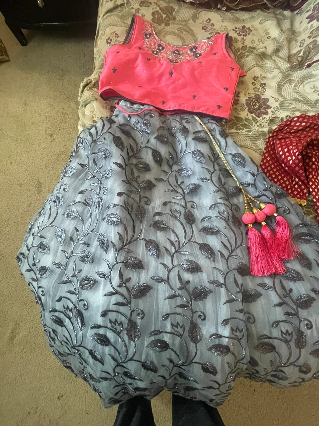 35Selling a beautiful lehenga choli set for girls! The top is a vibrant pink with lovely embroidery, and the skirt is a stylish grey with a delicate floral pattern. Perfect for a special occasion or cultural event!