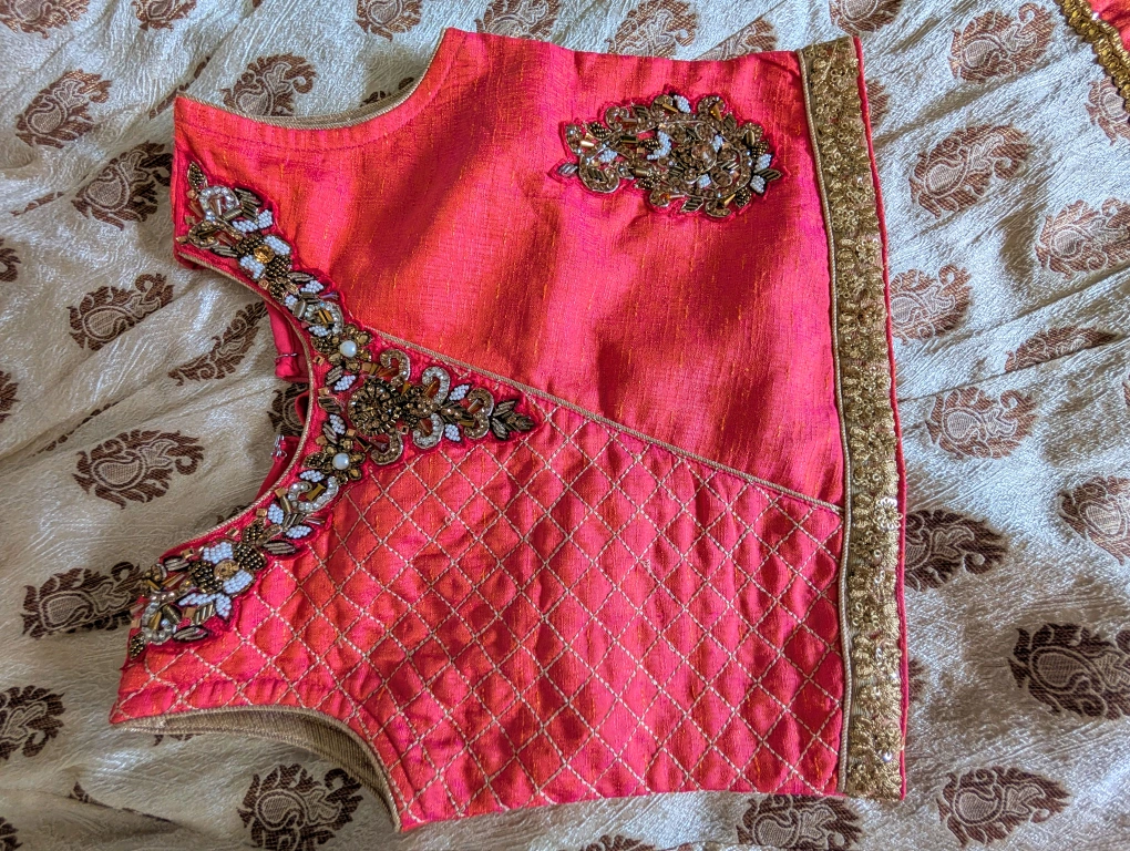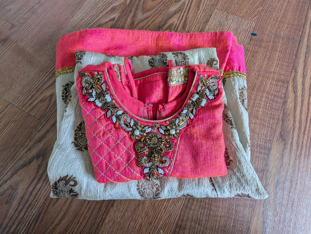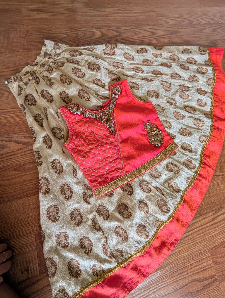 A beautiful Indian outfit for girls, featuring a vibrant pink top with intricate embroidery and a beige skirt. The outfit is in great condition and perfect for special occasions or cultural events. The detailing on the top is really lovely!