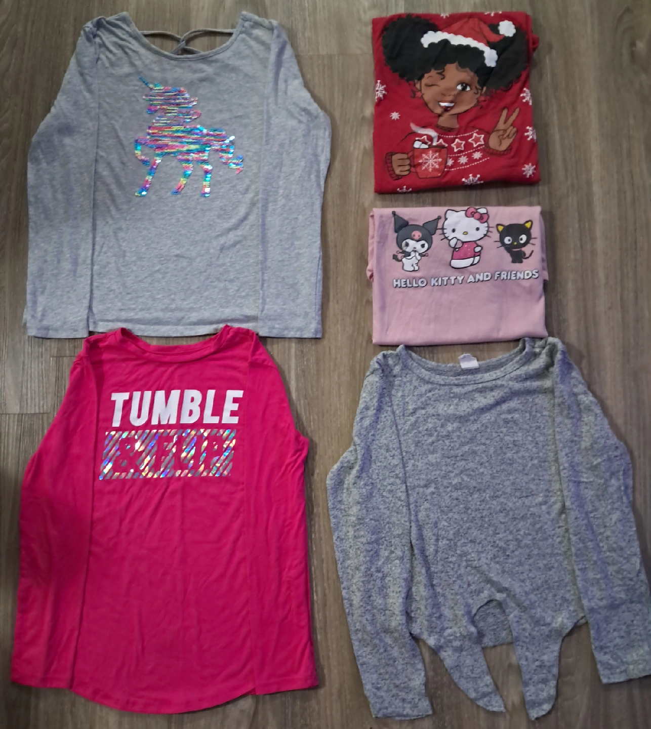 10Selling a bundle of girls' long sleeve shirts in size 7/8. Includes a grey unicorn shirt, a red Christmas themed shirt, a pink Hello Kitty and Friends shirt, a pink Tumble shirt, and a grey long sleeve shirt. All are in good condition and ready for a new home! All of them are long sleeves, except for the Hello Kitty one.