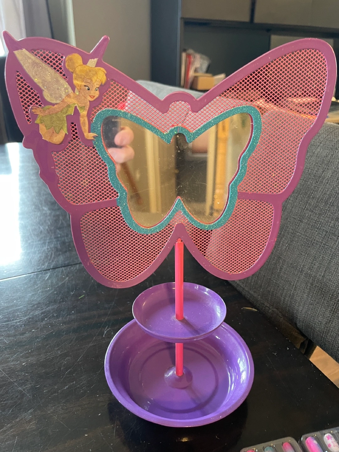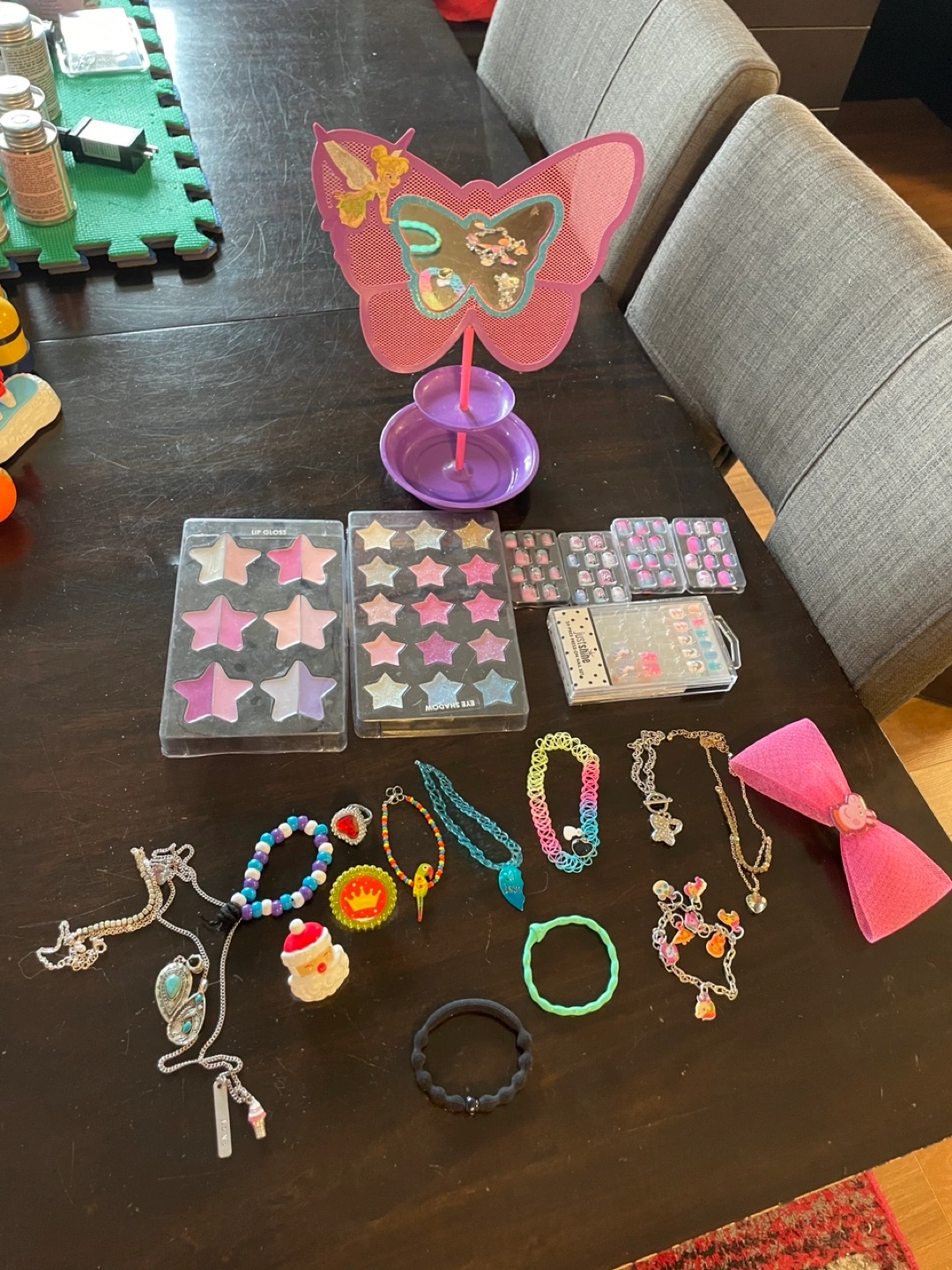 33An assortment of girls' makeup and jewellery items, including eyeshadow, lip gloss, nail stickers, and various necklaces, bracelets and rings. Includes a butterfly-shaped jewellery stand/ earring holder with a mirror. Some items are brand new and others have been lightly used.