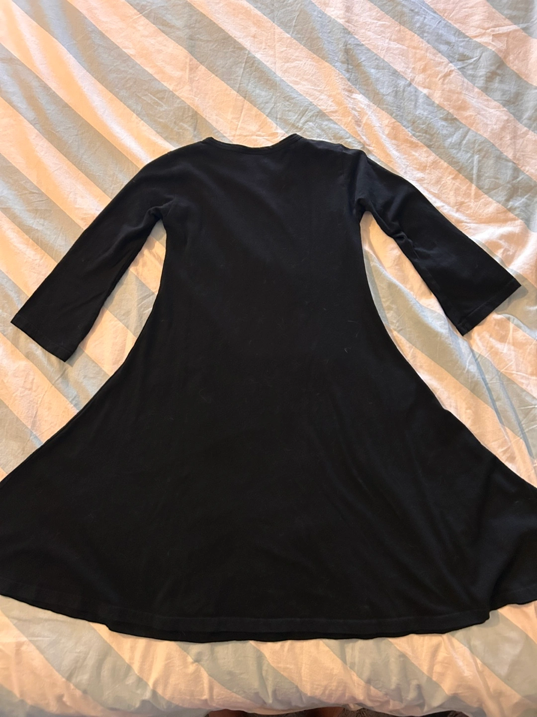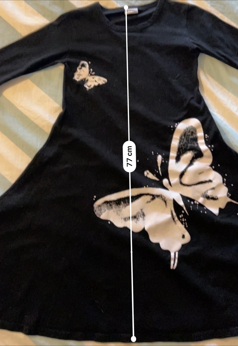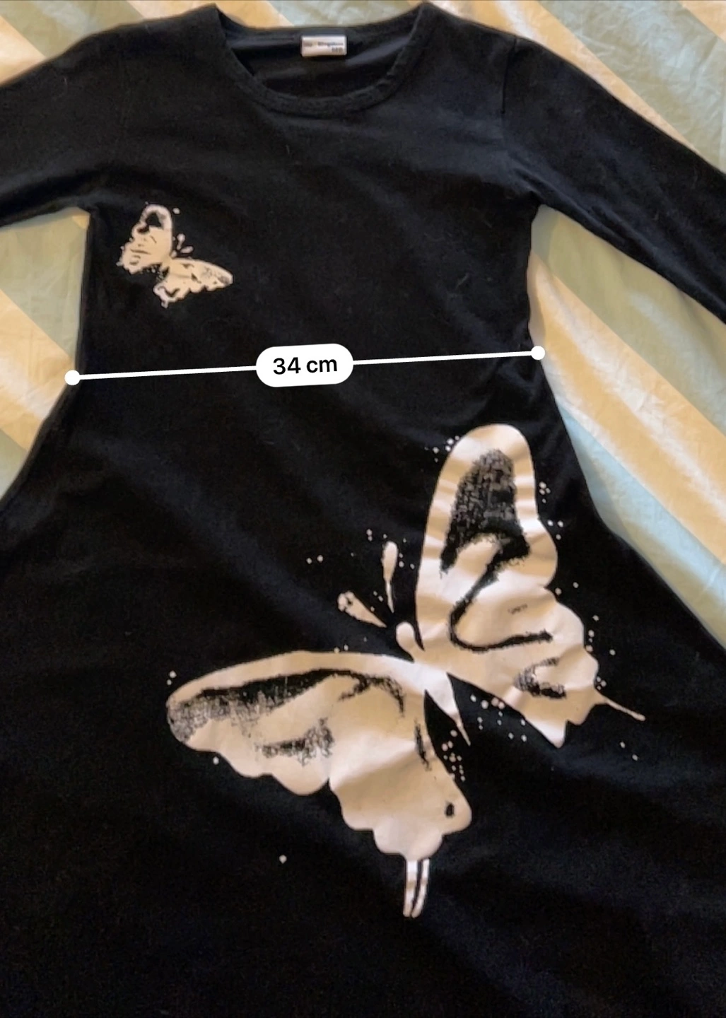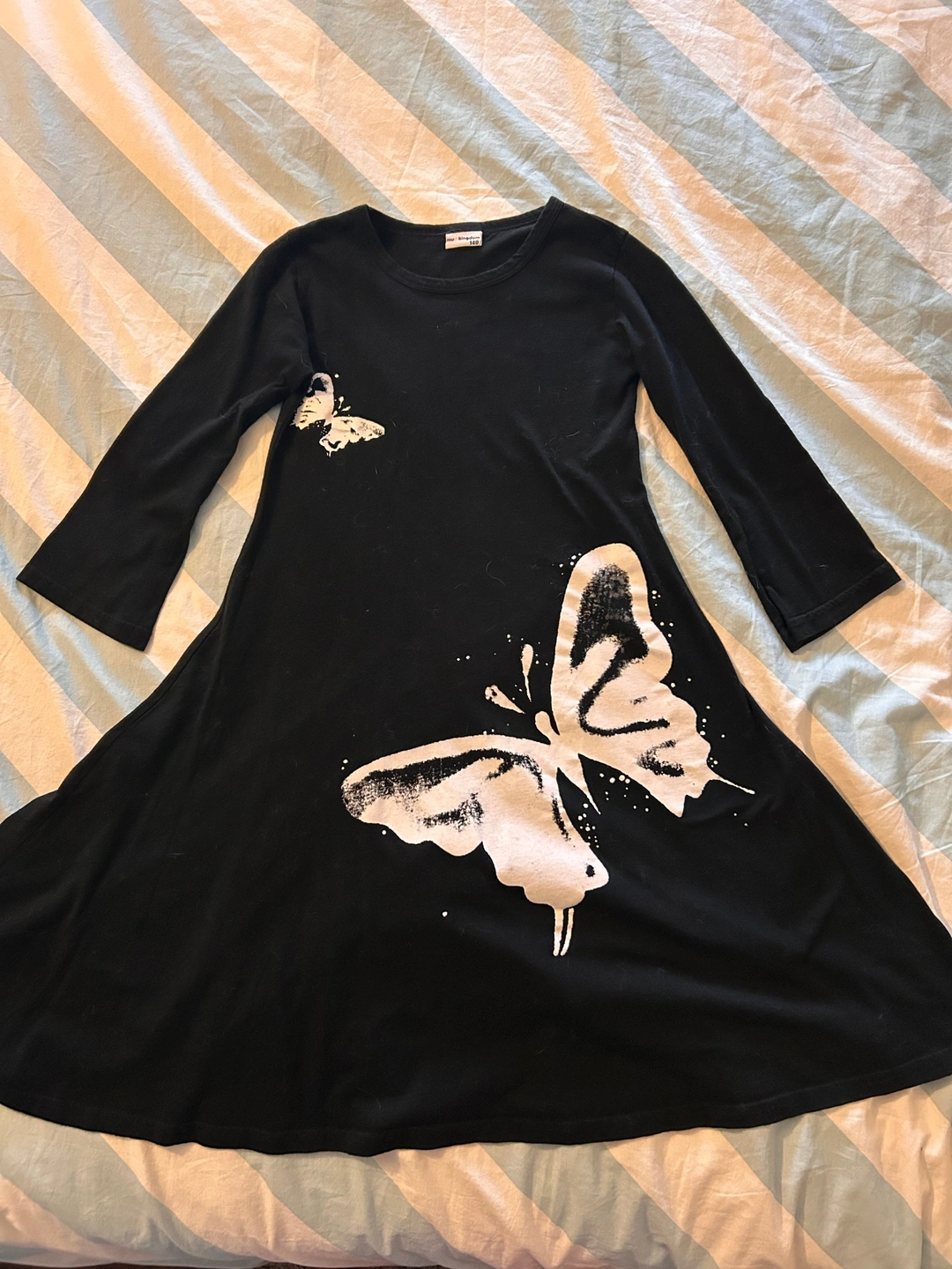Style: Long-sleeved A-line dress with a round neckline. Material: 100% Cotton, offering comfort and breathability. Design: Features prominent white butterfly graphics on the front. - CASH ONLY - SMOKE FREE HOME First come, first served