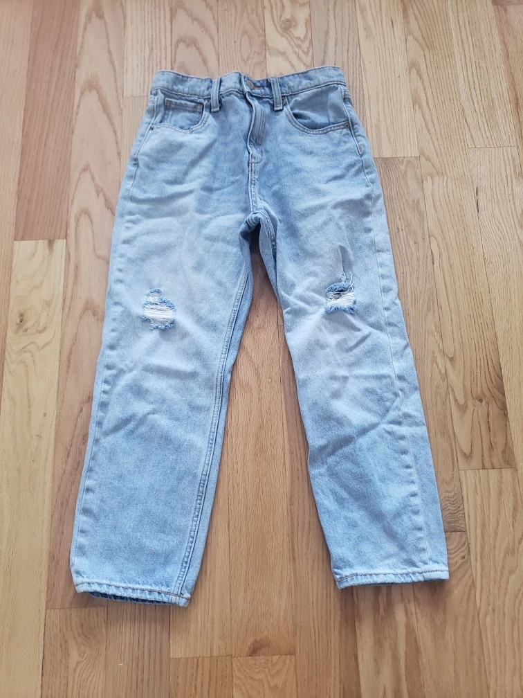 Selling a pair of light wash denim jeans with ripped detailing. These jeans are in great condition and ready for a new home!