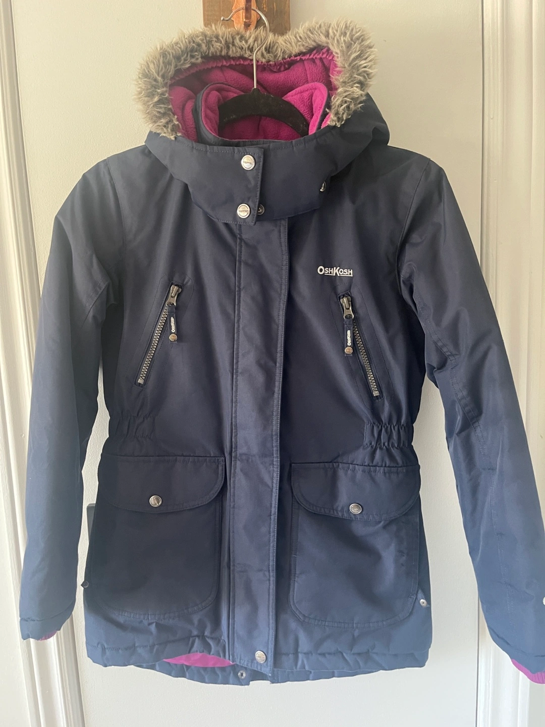 78Navy blue girls' winter parka. Features a faux fur-trimmed hood, purple fleece lining, zipper and snap closure, multiple pockets. Great for cold weather. Thickson and Dundas Whitby