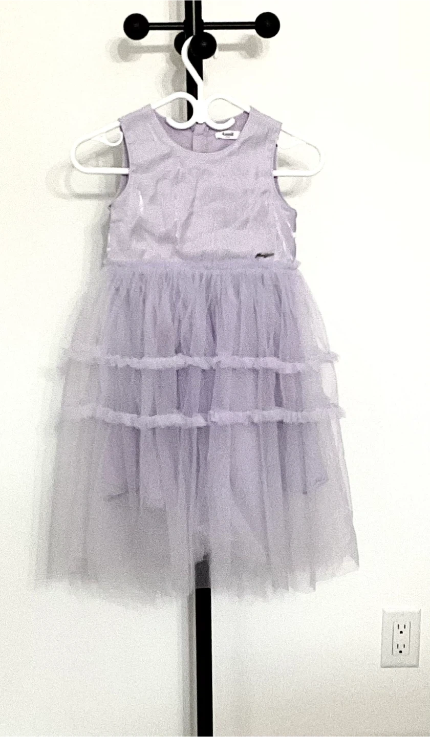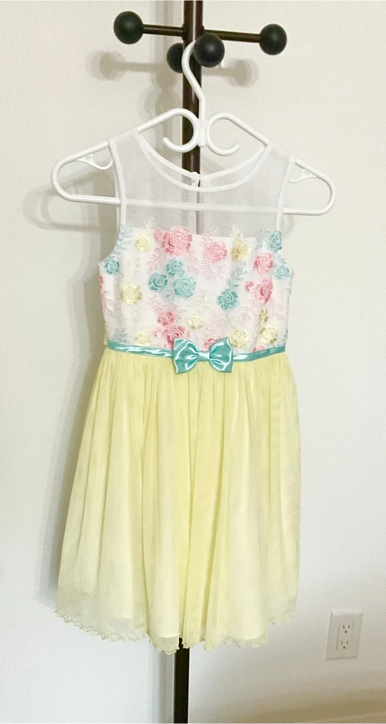 {Two adorable girls' dresses, perfect for parties or special occasions!} ∙One is a lovely lavender colour with a layered tulle skirt. ∙The other has a floral bodice with a yellow skirt and a sweet blue ribbon detail. (๑•́‧̫•̀๑) ∙Both dresses are in great condition and comfy to wear. ∙Size~130cm