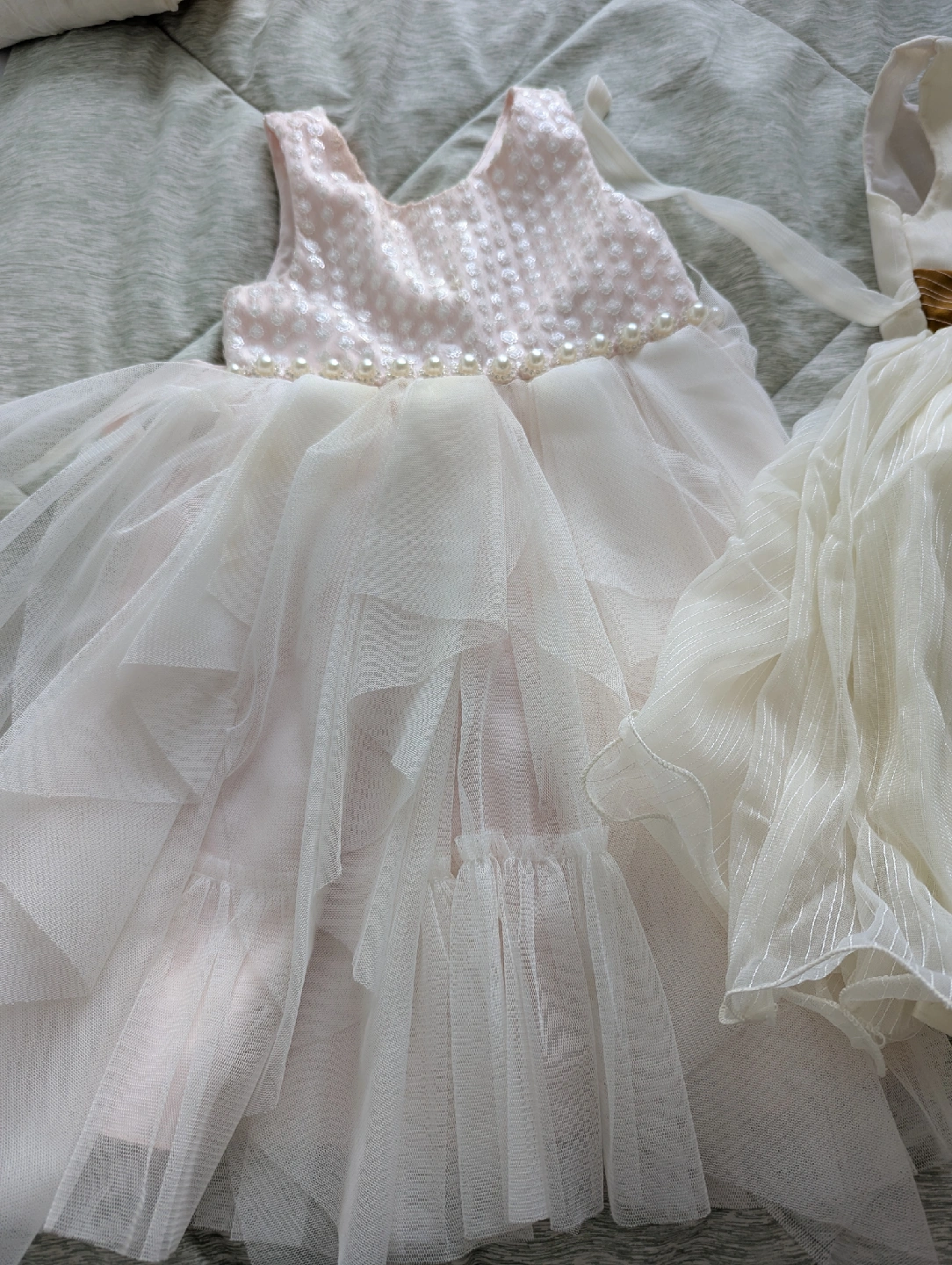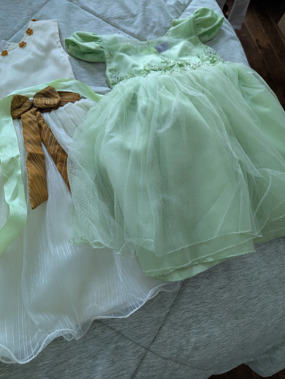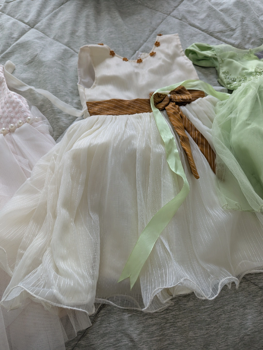 28Selling a collection of adorable girls' party dresses! There are three dresses in total, each with a unique design and colour. One is pink and white, another is white with a brown and green ribbon, and the third is green. They're perfect for special occasions or dress-up fun