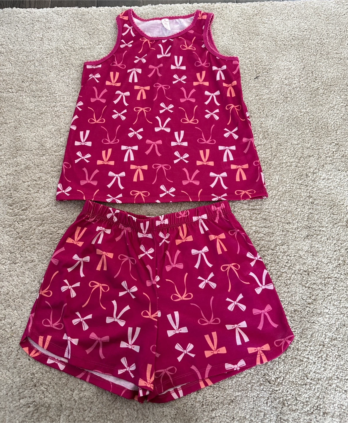 Cute pink pajama set with a bow pattern. Perfect for a comfy night's sleep! Size 10/12 Brand new - never worn