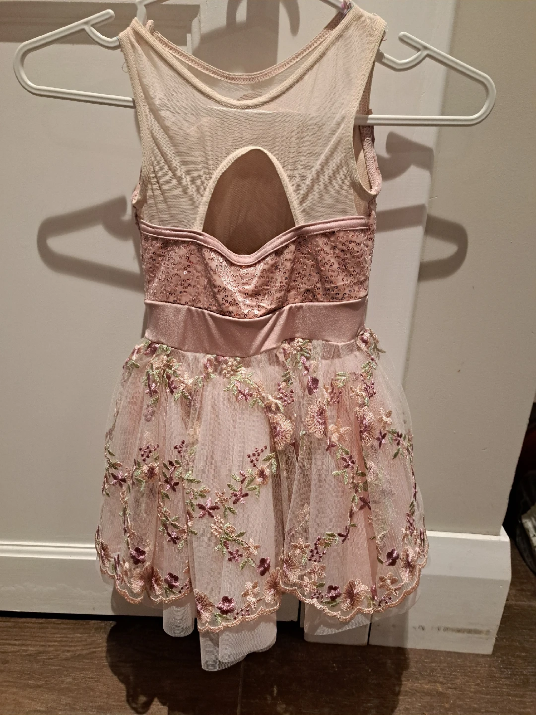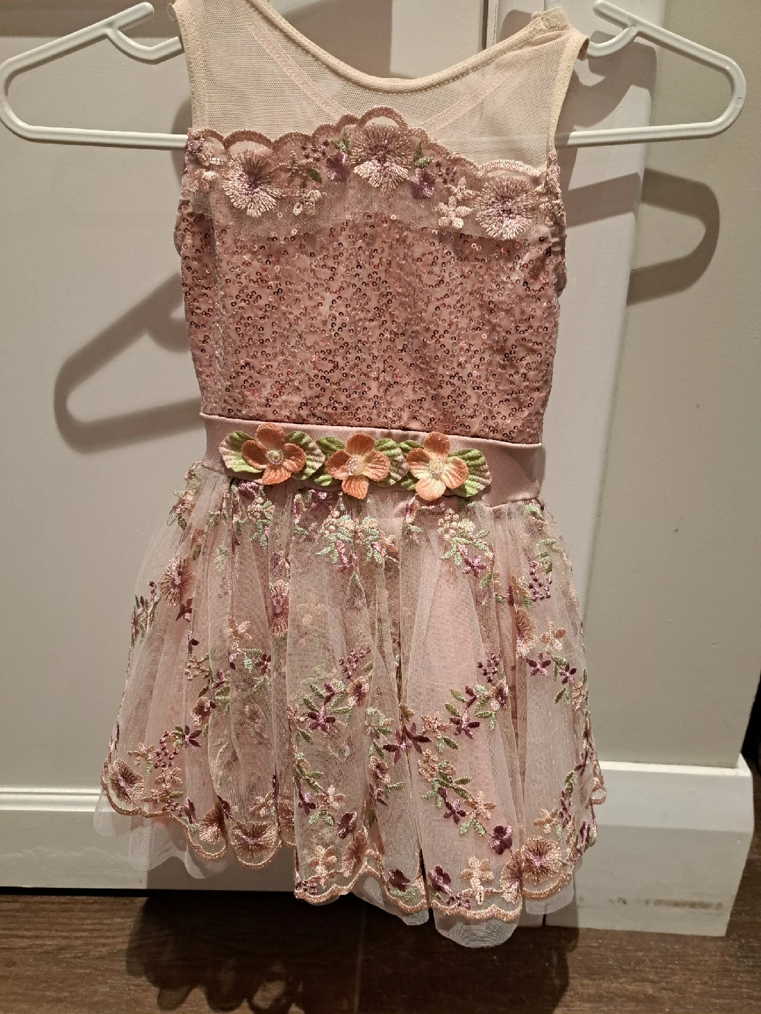 15A beautiful pink dress for girls, perfect for special occasions! The dress features floral embroidery and sequin detailing. It's in great condition and ready for a new home size 5/6