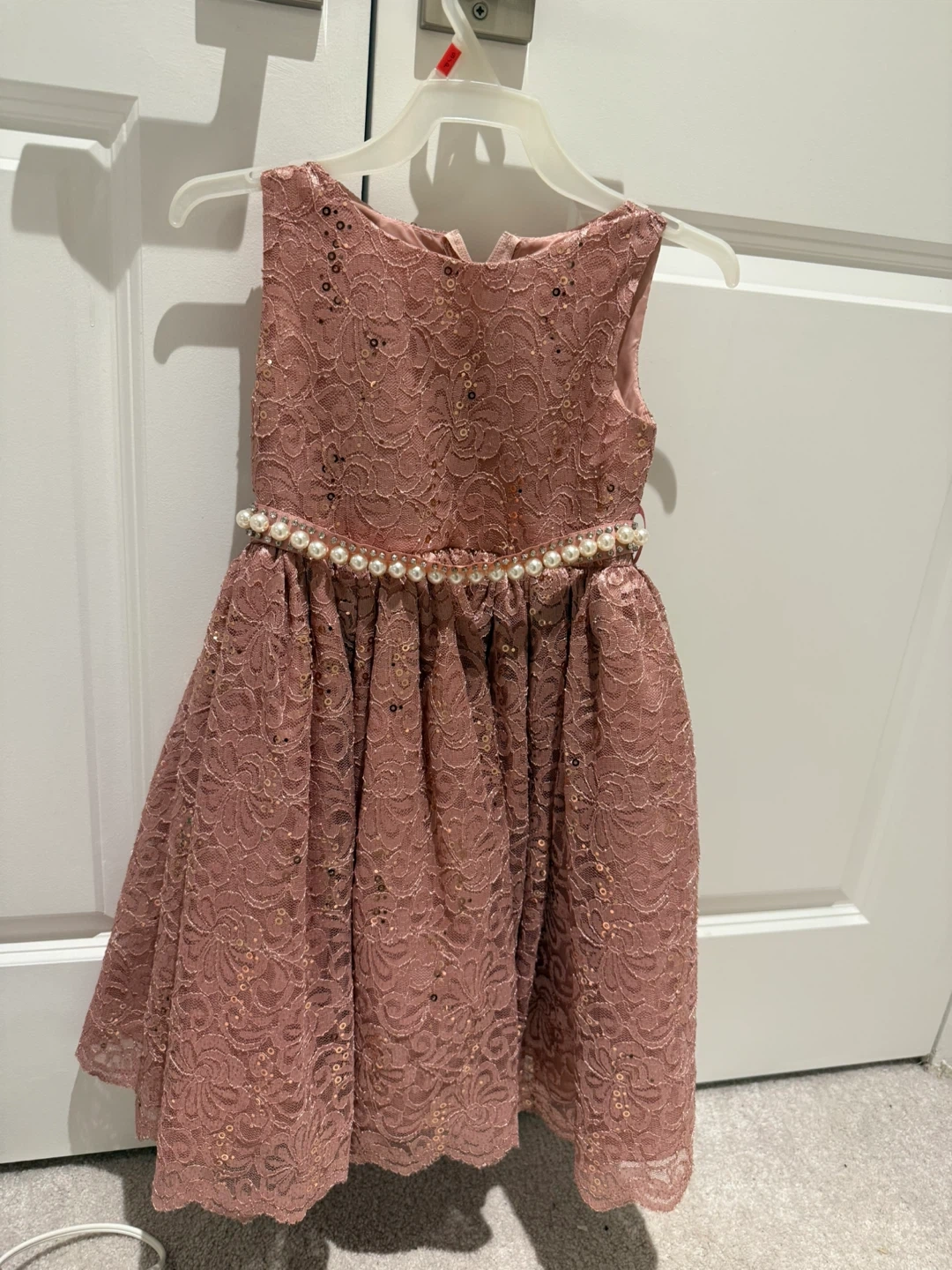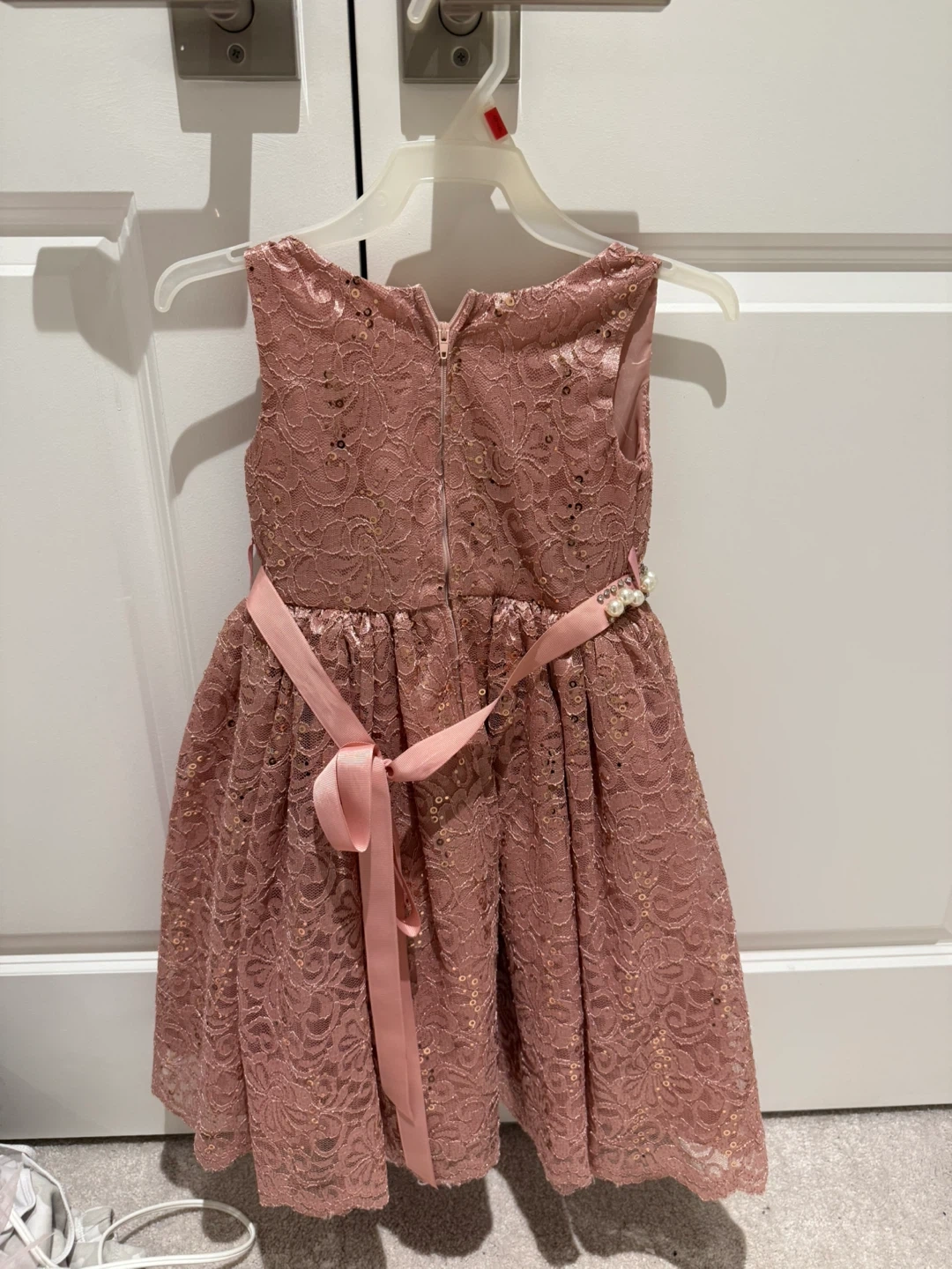 A beautiful pink lace dress for girls! It features a pearl-like beaded belt and a ribbon tie at the back. Perfect for special occasions or dress-up play!