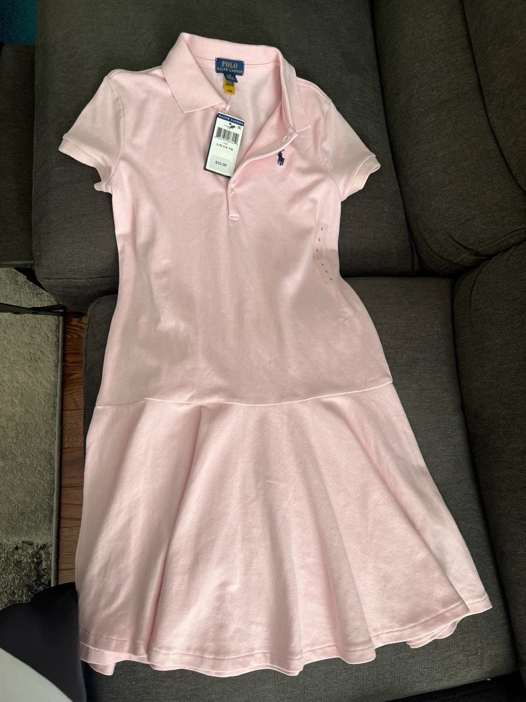10Pink Polo Ralph Lauren dress. Size large (10-12). Short sleeves, collared. Flared skirt. This is a brand new with tags Ralph Lauren girls pink short sleeve polo dress, perfect for casual or semi-formal occasions. The dress features a classic polo collar, a three-button placket, and the signature embroidered pony at the chest. Additional details: * Brand: Ralph Lauren * Colour: Pink * Sleeve Length: Short Sleeve * Style: Polo Dress 33 inches or 84 centimetres in length from shoulder to end of skirt This dress is in pristine condition and has never been worn. Similar new Ralph Lauren dresses are typically listed for around $50-$80. Grab this adorable dress for your little one today! Don't let this fabulous find pass you by!