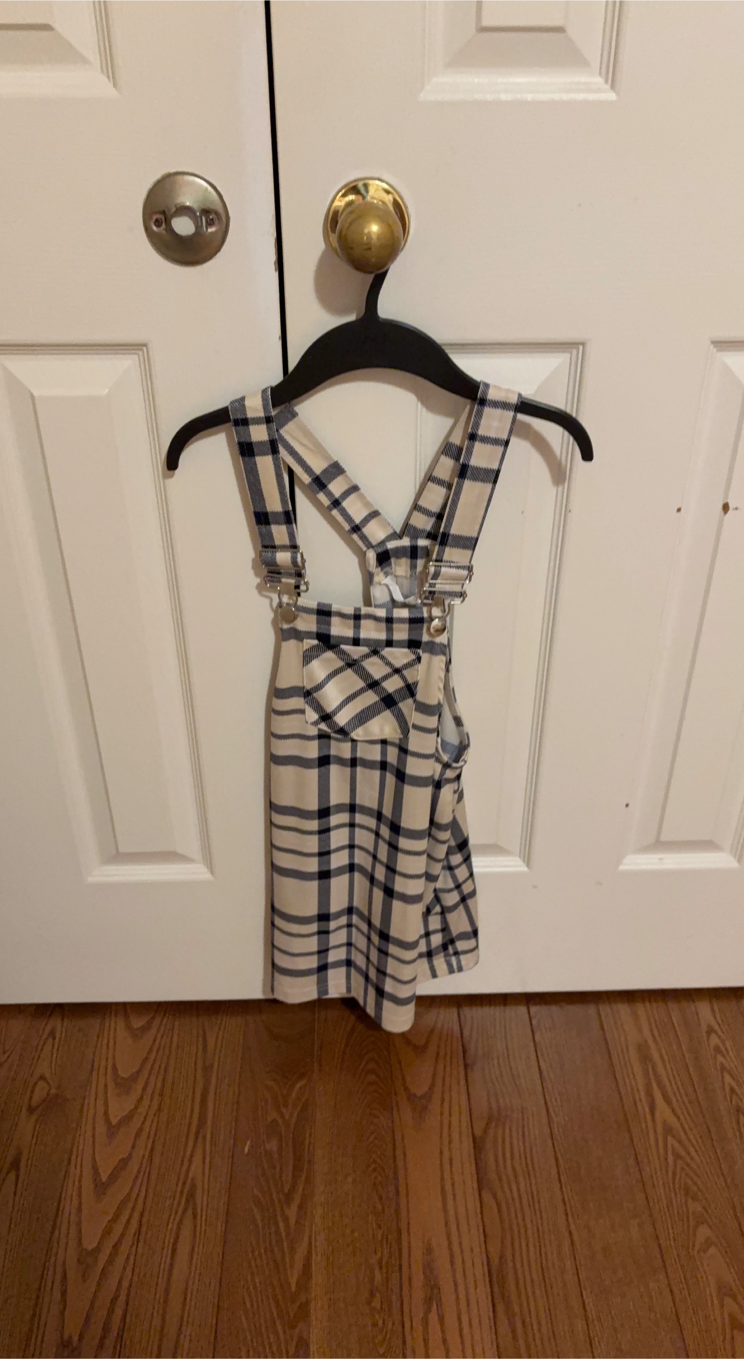 Cute plaid overalls dress for girls! The dress features a classic plaid pattern in cream and navy. Adjustable straps ensure a comfortable fit. Perfect for any occasion!