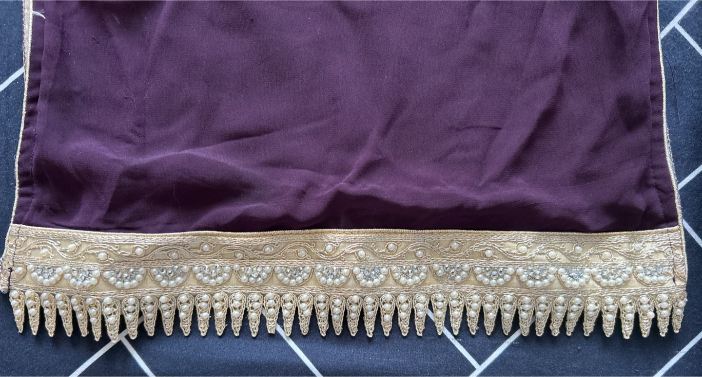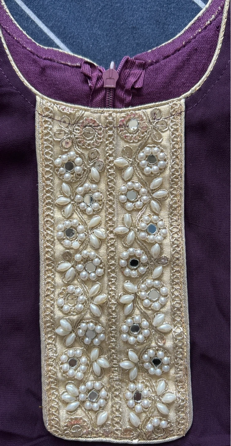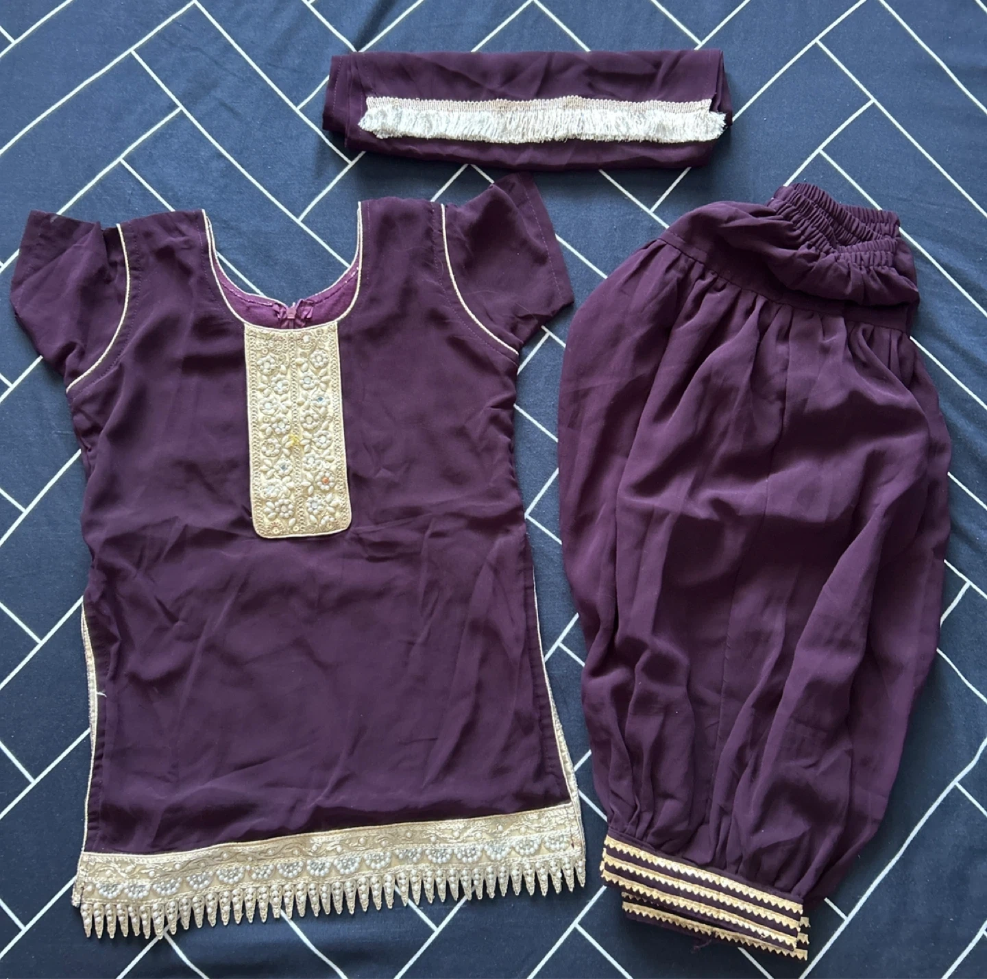 A cute salwar kameez for girls! It's a beautiful purple colour with gold detailing. Perfect for special occasions or just dressing up