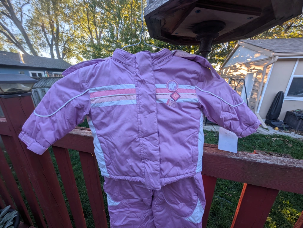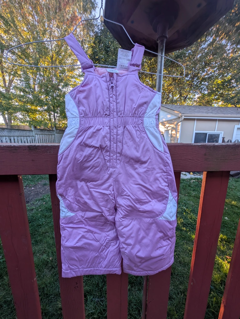 Girls size 12 months, Athletic Works, 2 piece snowsuit. Coat is fleece lined, front has 2 pockets, zipper and velcro closure. Hood is fleece lined with faux fur trim, and velcro closure, fully removable. Snow pants have adjustable straps to adjust length.