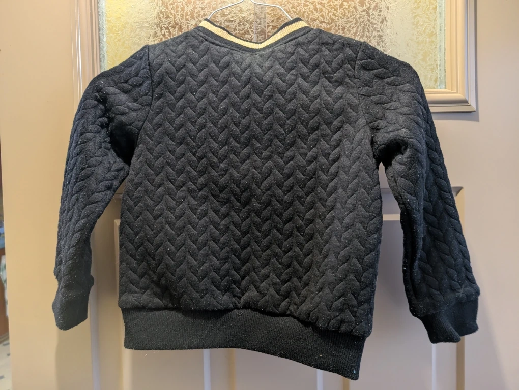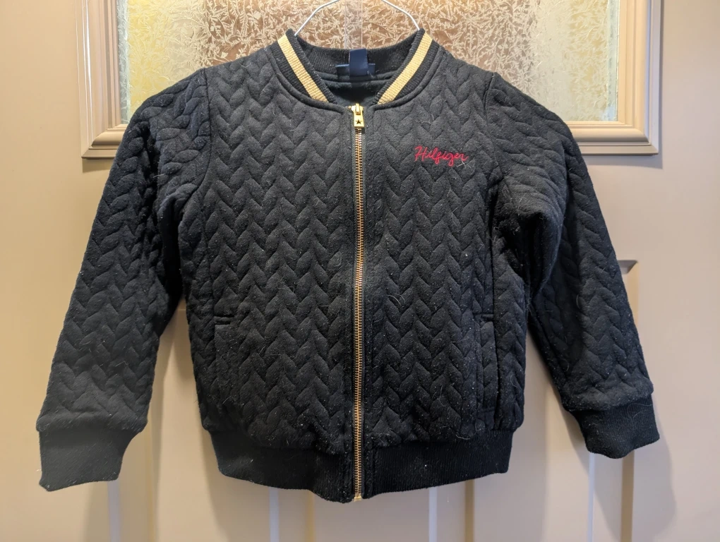 96Girls size 6x Tommy Hilfiger zip up sweater. Black with gold trim neck line. Full zip front, quilted texture, 2 front pockets. Like new, no rips, tears, or stains