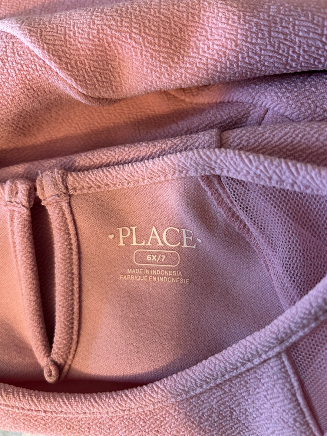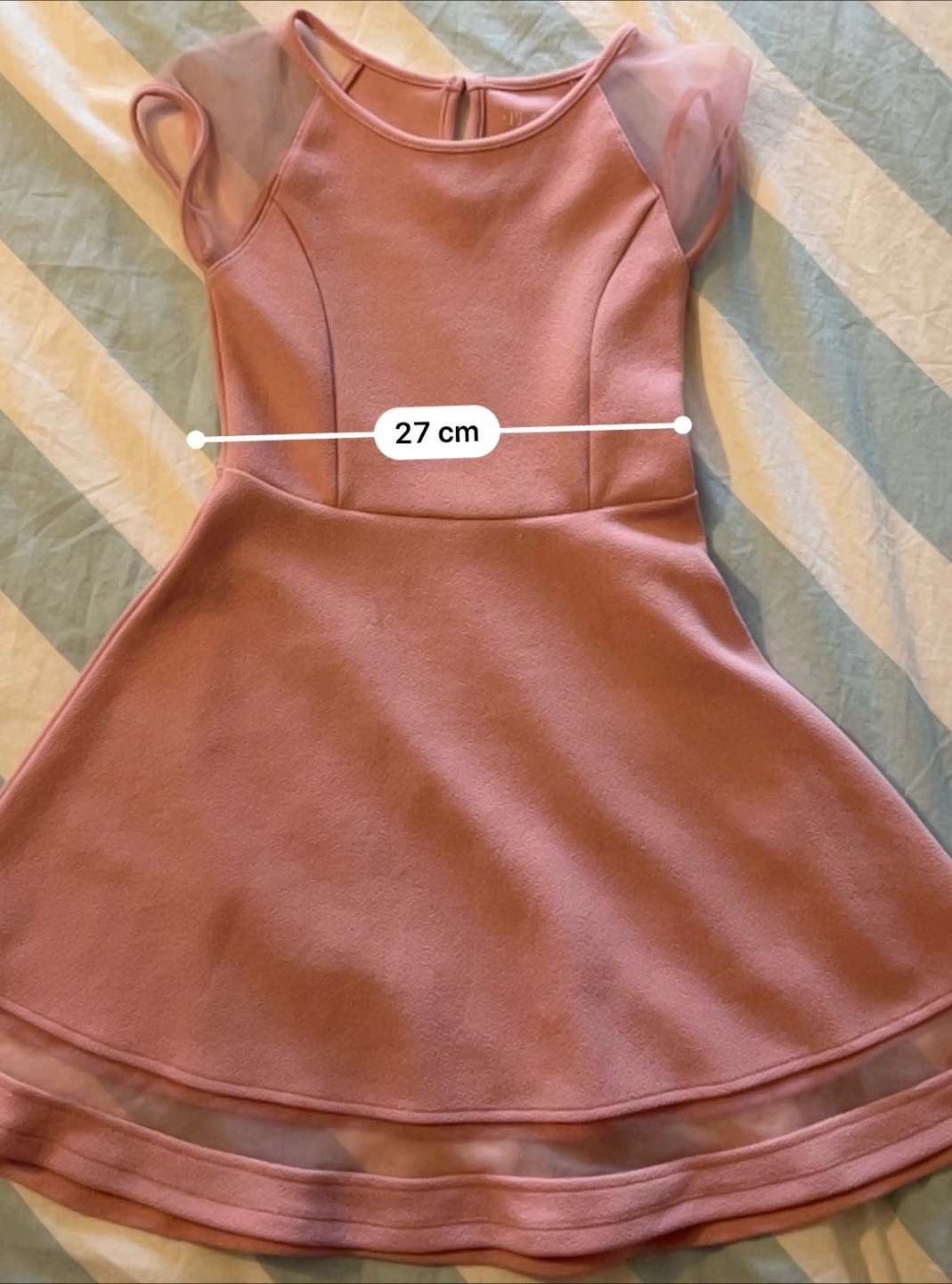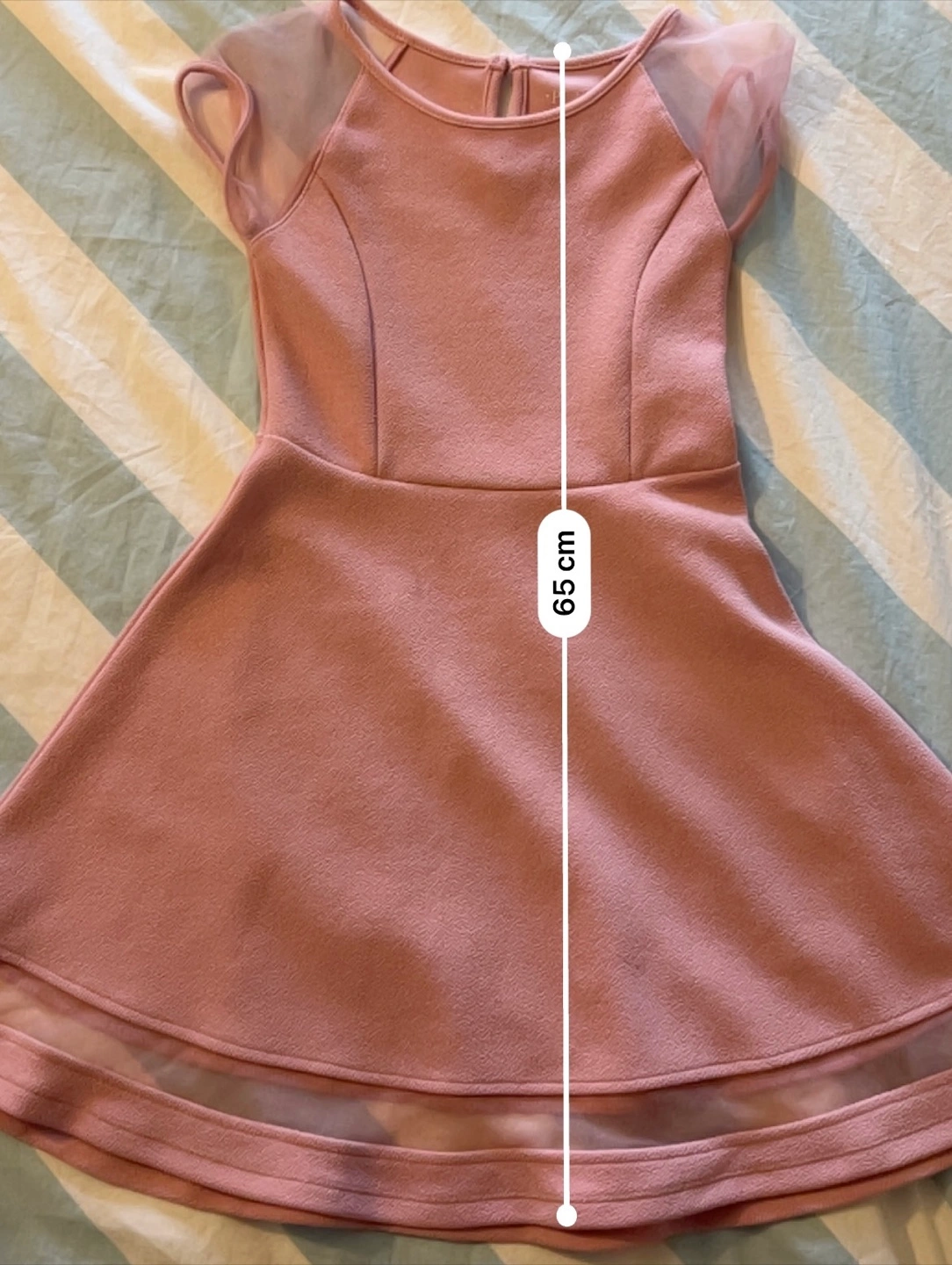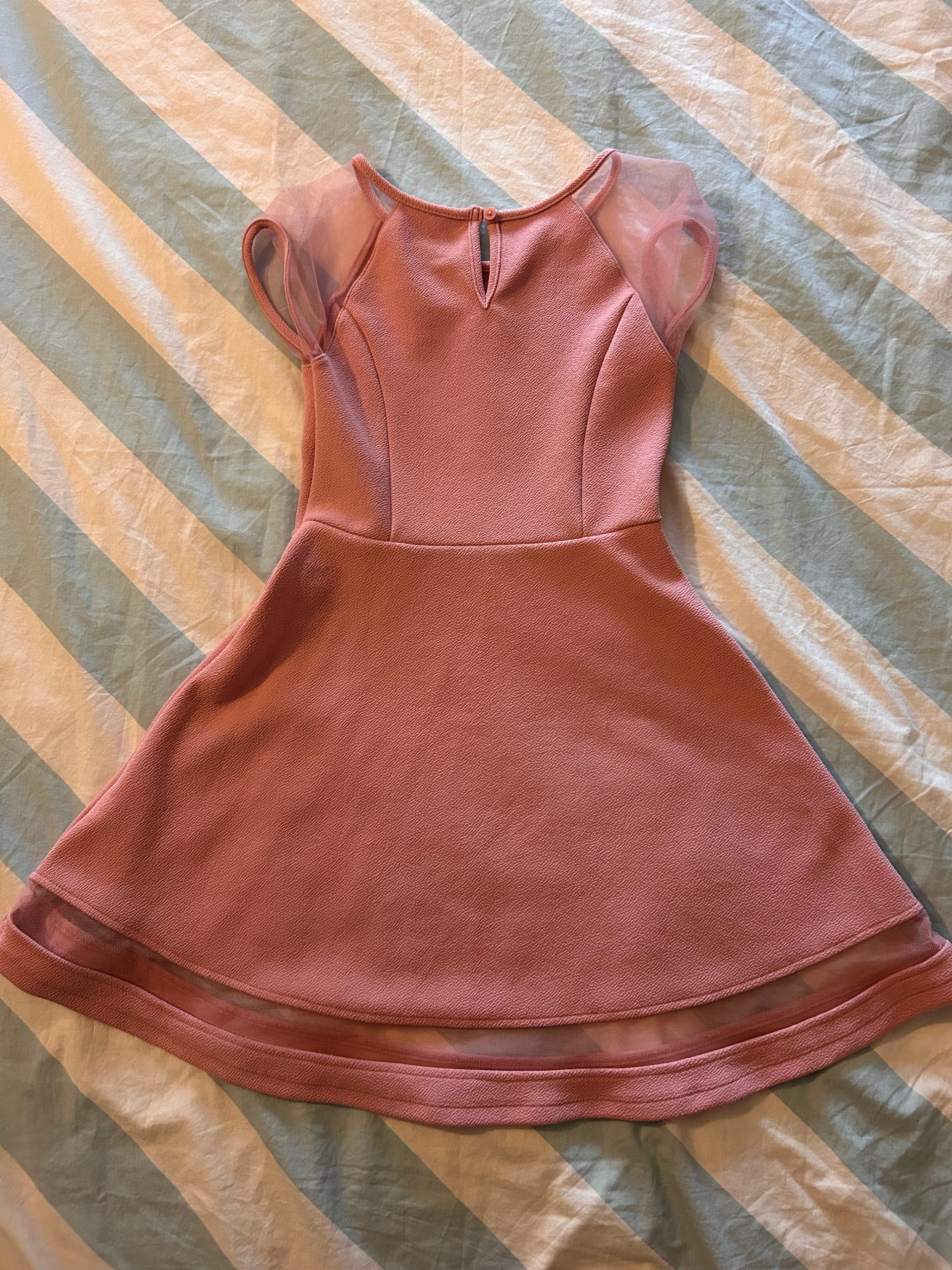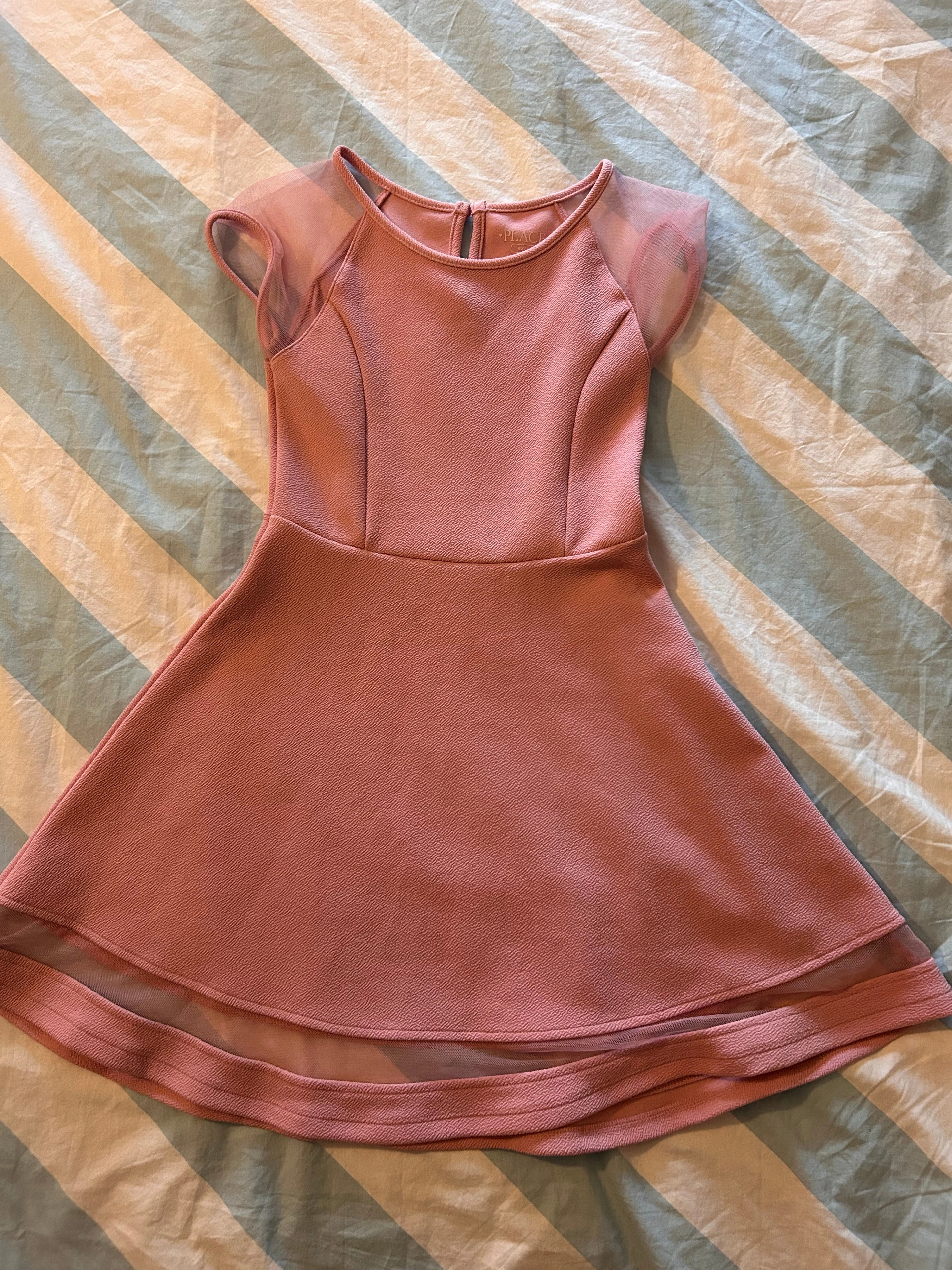 Color: Soft Pink. Brand: The Children's Place Style: Short-sleeved dress with sheer/mesh cap sleeves and a matching sheer band near the hem of the skirt. Details: Bodice has contoured seam details; round neckline with a small keyhole opening and button closure at the back. Skirt: Flared A-line skirt. - CASH ONLY - SMOKE FREE HOME First come, first served