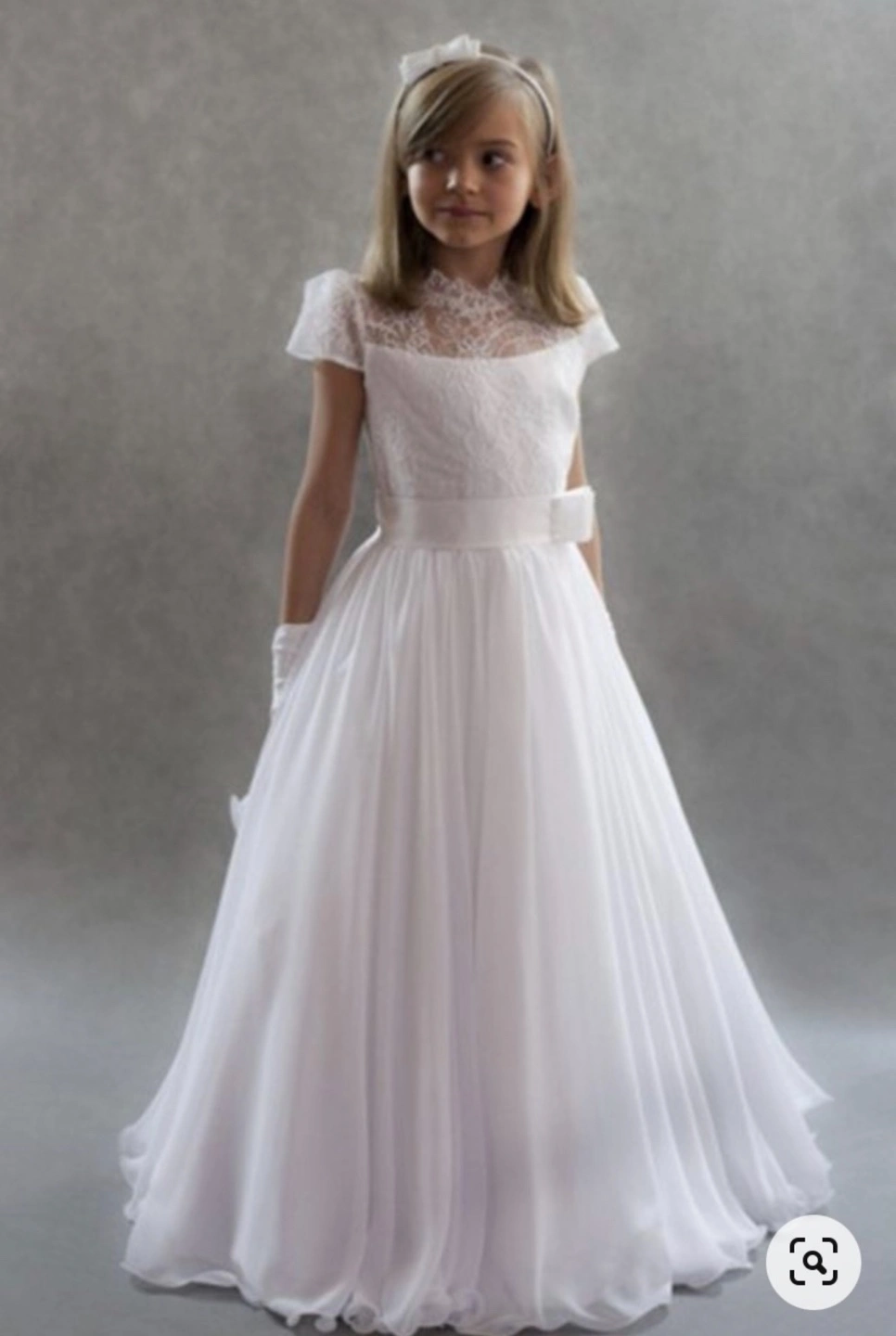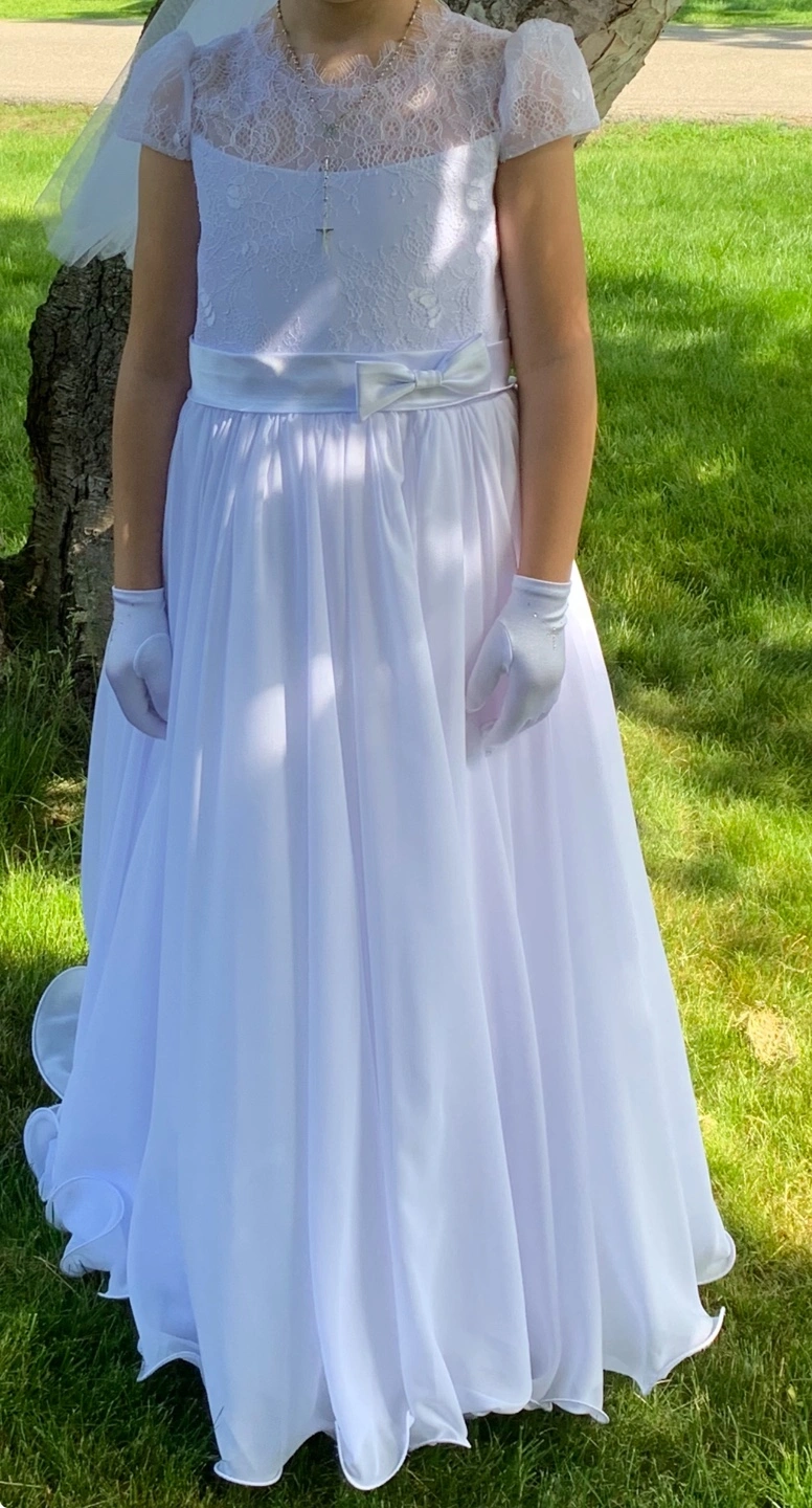 Beautiful white communion dress. Lace bodice, short sleeves, and a flowing chiffon skirt. Perfect for a communion or special occasion. Includes matching gloves.