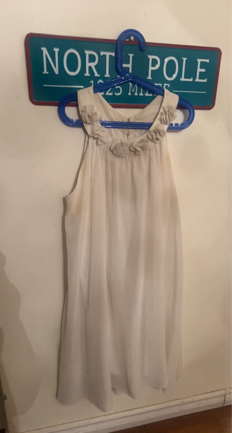 782Selling a white sleeveless dress. It has a lovely floral detail around the neckline. Please note this is being sold for cheap price!