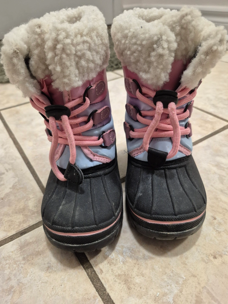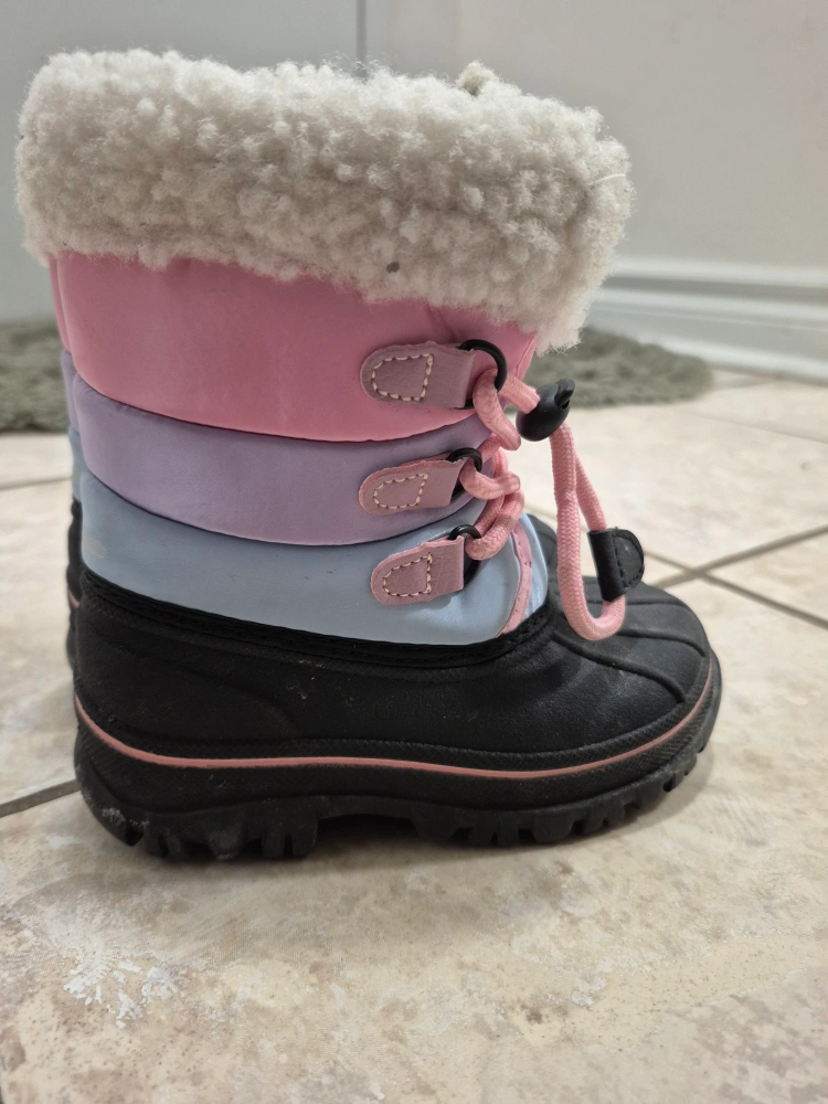 These girls' winter boots are in great condition and ready for some snowy adventures! They're a size 7 and feature a cozy, insulated lining to keep little feet warm and dry. The cute pink, lavender, and blue design is sure to be a hit!baby grew out of it pet free smoke free cash only