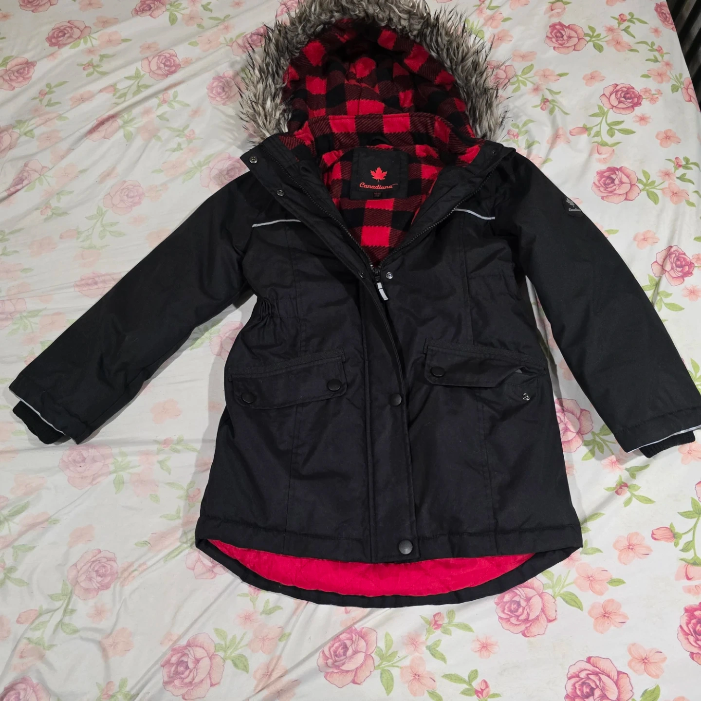 54Selling a size 7/8 Medium girl's winter coat. It's black with a red and black buffalo plaid lining in the hood. The hood also has a faux fur trim. It has a few pockets on the front