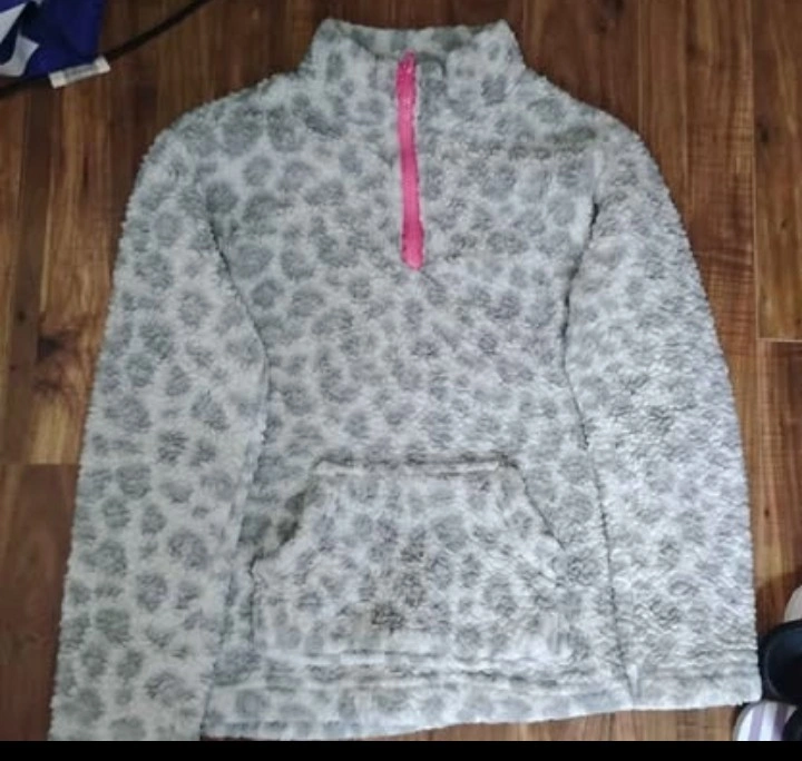 25🥕Cozy up in this super soft grey and white leopard print pullover! It features a cute pink zipper and a handy front pocket. ,Brand name and excellent condition.