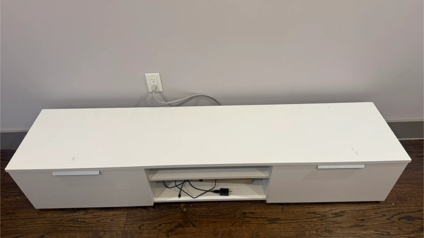 Modern white media console. Has two closed storage cabinets on the sides. Open shelf in the middle for devices or decor. Good for living room or bedroom. Minor marks on top surface, overall good shape. Length 68 inch and width 16 inch, height 13 inch.