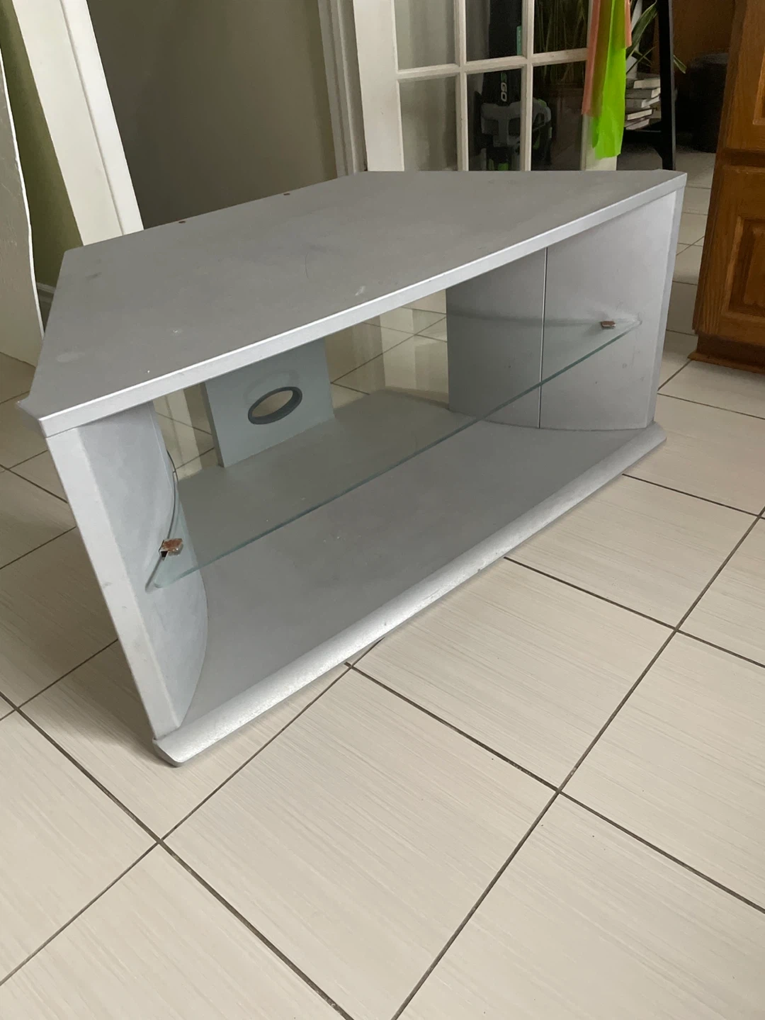 Silver corner TV stand with two glass shelves. It's a triangular unit designed for media consoles. Great for organizing electronics and keeping your living space tidy!