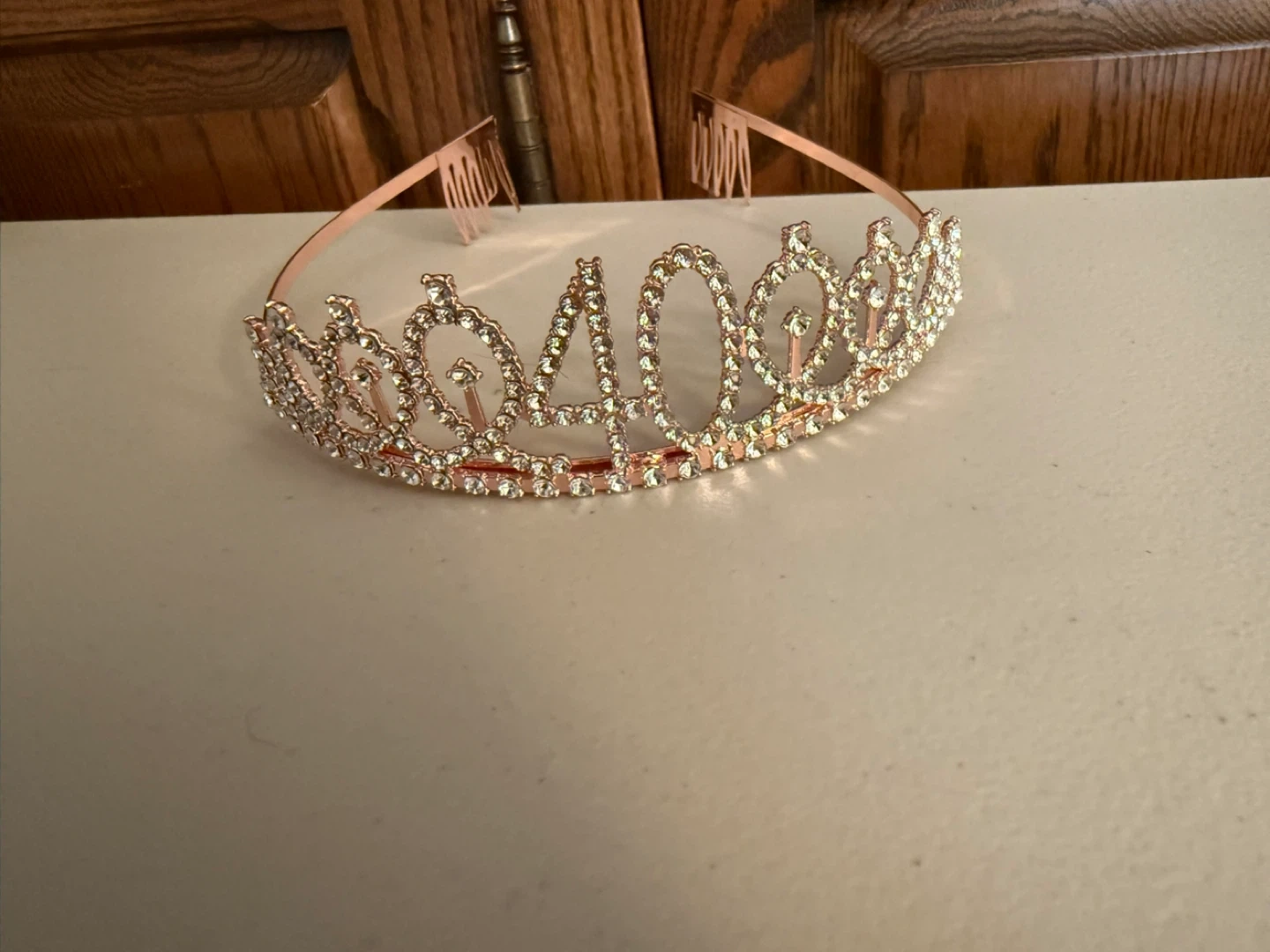 Celebrate your 40th birthday with this sparkly rose gold sash and rhinestone tiara set. The sash reads '40 & Fabulous' and comes with a pearl-adorned safety pin. The tiara features clear rhinestones and comb teeth for secure wear. Perfect for making birthday memories!