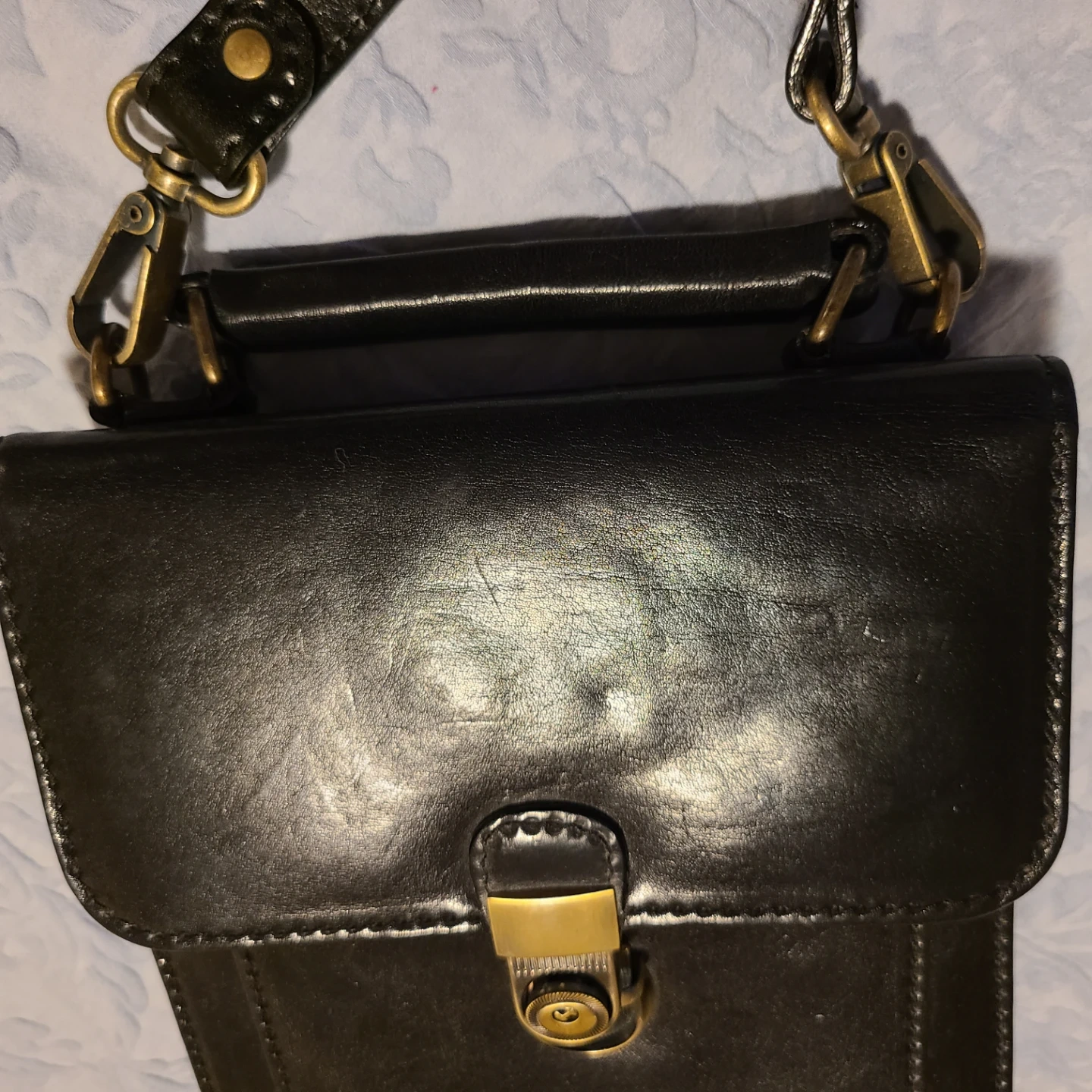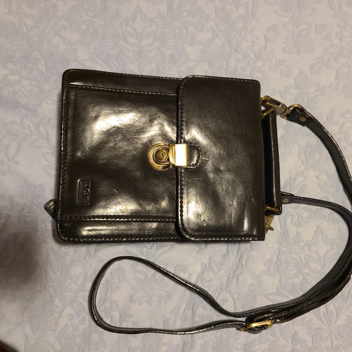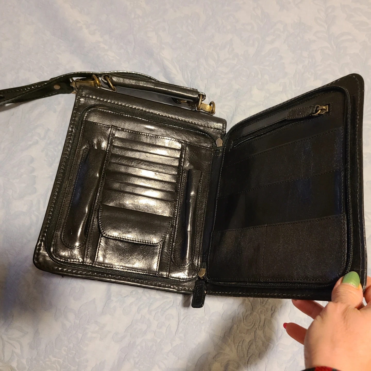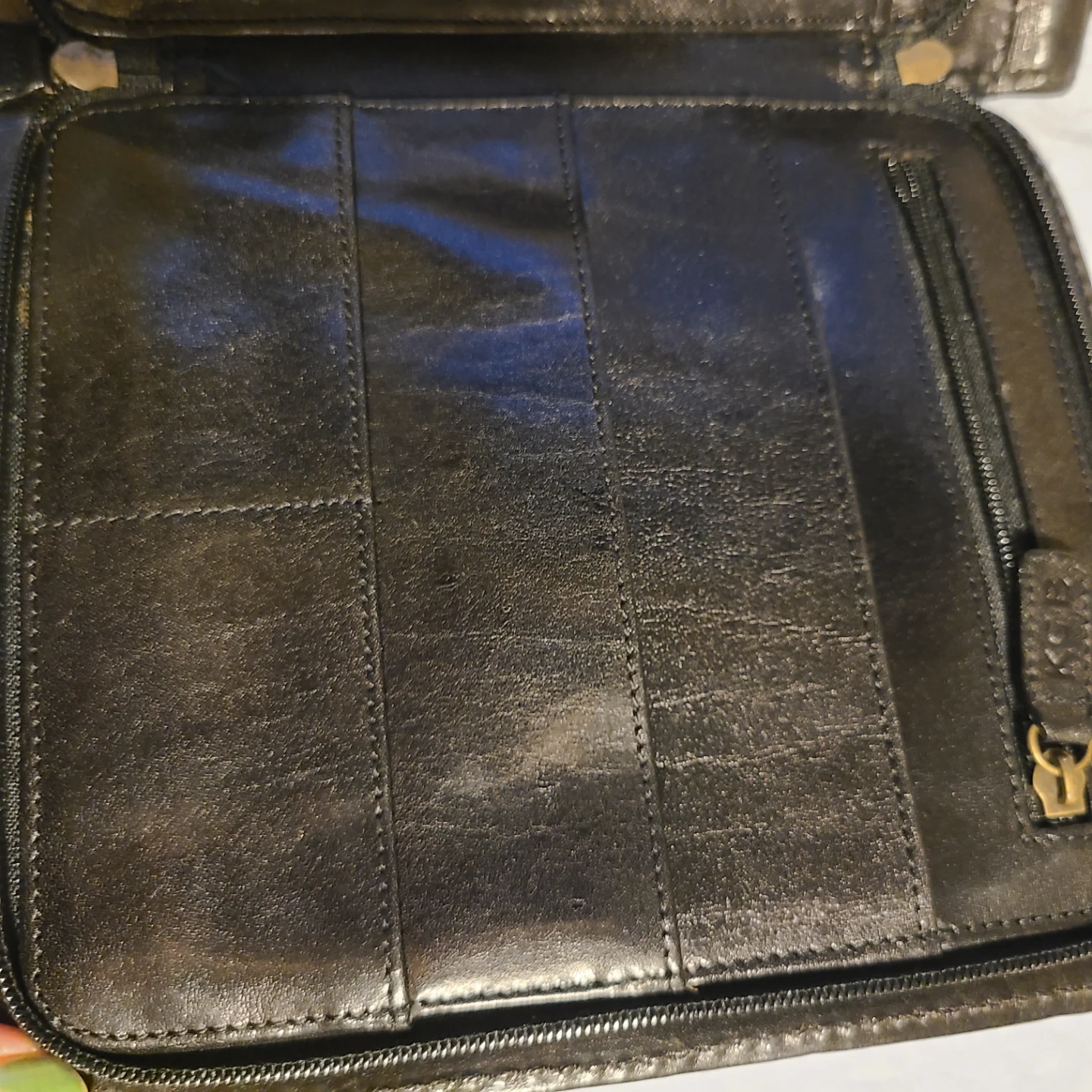 This new KGB organizer bag is crafted from black leather. It features multiple card slots and zippered pockets for your essentials. It's suitable for organizing documents or personal items on the go.