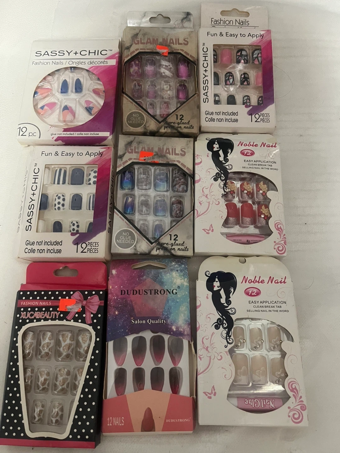 This lot includes seven different sets of fashion press-on nails. Brands featured are Sassy+Chic, Glam Nails, Xucabeauty, Dudustrong, and Noble Nail. Most sets contain 12 pieces and are noted as glue-not-included or pre-glued. Designs vary with different colors and patterns. These are great for a quick manicure change!