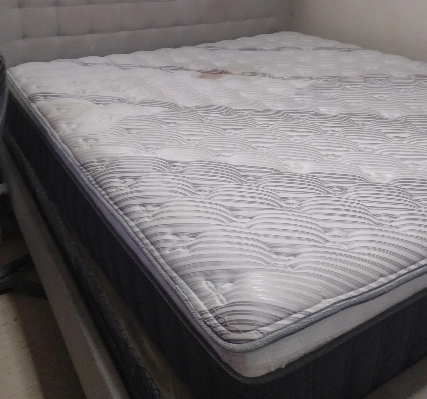 Used Sealy mattress. It's a queen size with a grey and white striped pattern. There are some faint stains on the surface, but no rips or tears. It's a standard thickness mattress.